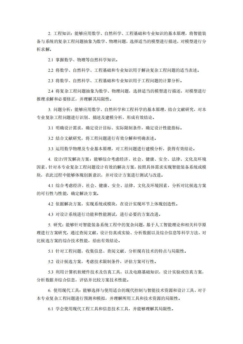 智能装备与系统专业培养方案一、学制及总学分要求1.标准学制:4年:学习年限:3-6年2.总学分要求:167学分二、授予学位工学学士学位三、培养目标面向国家工程前沿领域,尤其人工智能与智能制造领域,培养具有社会主义核心价值观,德智体美劳全面发展,复合型“新工科”人才,使其掌握自主感知、人工智能、数据科学、优化决策及运动控制的最新成果,具备设计、优化、研制智能装备的能力,同时培养从智能系统角度设计和应用复杂系统的能力,服务现代制造业与智能技术高度融合发展的国家战略。具体的能力目标如下:1.掌握智能化理论和方法。在人工智能、数据科学、控制与优化及系统科学方法方面培养基础能力,建立具备经典控制论、信息论、系统论为基础的专业理论体系。2.掌握智能装备研发技术。具备智能装备系统研发所需多种开发技术,培养工程实践应用潜力,面向国家重大工程需求进行设计、开发和优化,实现人工智能、大系统等理论的应用驱动设计。3.具备系统工程与复杂系统设计能力。智能装备是多种装置构成的协同系统,涵盖从智能传感、信息传输、控制决策到驱动执行的多种综合技术应用。培养系统工程设计方法、大数据分布式计算能力,注重智能化技术构建应用系统,强调理论研究的实际实施、验证。4.具备专业认证所要求的综合能力。包括有效运用工程知识和技术原则解决本领域复杂工程技术问题的能力,良好的团队合作能力和沟通能力,终身获取知识和跟踪前沿技术的能力,并培养遵守工程职业道德和社会责任感的意识。四、毕业要求及指标点分解1.品德修养:理解并掌握科学的世界观和方法论,具有良好的思想品德和社会公德,具有家国情怀和社会责任感,能够践行社会主义核心价值观。1.1理解并掌握科学的世界观和方法论。12具有良好的思想品德和社会公德,具有家国情怀和社会责任感,树立并践行社会主义核心价值观