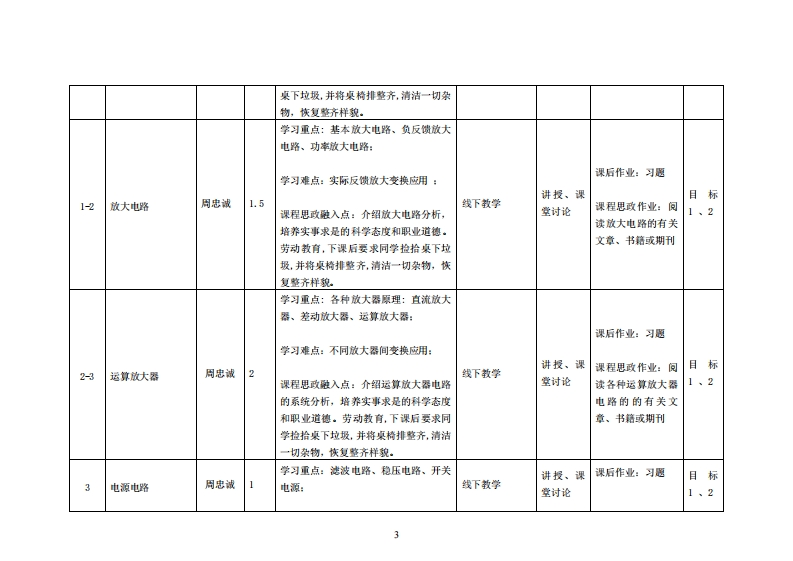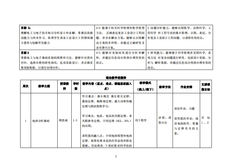 《电子电工技术》教学大纲裸程名称:电子电工拉术课和类别(必修/选修),修课程英文名称:Electronic and electrical technology总学时/周学时/学分:32/2/2其中实整/实液学时16先修课程:高整兼学、大学物理基赠电韵后续课程支排授课时间:周三12授课地点:议11提课对律:2022工业设计开裸学洗:粤合产业科技学洗任课数甲姓名职称:周忠诚/副教授答票时间、地点与方式:课间_任何时段:课后_预约即可课程考核方式:开卷()闭卷()课程论文()其它()使用微材,《模拟电路和数字电路白学手册》,蔡杏山主编,人民邮电出版社,1SW9787115486417课程物介:本课程介绍模拟电路、数字电路和电力电子电路,主要内容有电路分析基础、放大电路、集成运算放大器、电源电路、数字电路基础与门电路、数制编码与逻辑代数、组合逻辑电路、时序逻辑电路、脉冲电路、A/D(模/数)和D/A(数/模)转换电路、控制技术、交流调压电路、交-变变频电路。它的墩学目的是培养学生具有电路学的专业知识,以及应用这些知识进行各种电路的分析方法的能力.课程兹学目标及对毕业要求指标点的支排课程教学目标支撑毕业要求指标点毕业要求目标1:1-1能将数学、自然科学、工程基础1工程知识:能够将数学、自然科学、工程基础了解电工与电子技术知识,培养具有工业设计专业知识与及专业知识用于工业设计工程问题的和专业知识用于解决复杂工业设计工程问题。技能的工程技术人才表述。