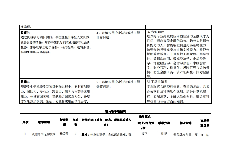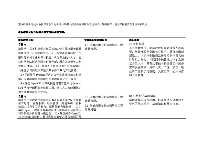 《机器学习》教学大纲课避名称:机器学习课和类别(必修选修),选修课程文名称:Machine Leaming总学时周学时学分,32/22其中实险实戒学时,16先德课是:Python与大数据分析后续课程支排无授课时间:318周星期一34节)授课地点:实217课对律:21级-金融1班(科技)开裸学洗:粤台产业科技学院任课就师姓名称:杨荣贵/副教授答聚时间、地点与方式:课堂或课后,教室或通讯软件,当面或线上答疑裸被方式,开卷()闭卷()课程论文()其它()非试卷类报告使用教村PyTorch深度学习实战-微课视频服,日云翔.等,清华大学出版社,2023-06-22,ISBN:9787302568209款学考资料:(1)《OpenCV轻松入门面向Python》,李立宗,电子工业出版社,2019年5月,ISBN:9787121362903(2)自编材料课程物介本课程是经济与金融专业(金融科技)的专业选修课,课程以PyTh为基础,介绍机器学习的基础蜘识与常用方法,全面细致地提供了基本机器学习操作的原理和在PyTh框架下的实现步骤·再由浅入深地以实战案例讲解的方式,对于误差反向传播法、卷积运算等进行详细剖析,使读者在实现层面上理解:此外还加入了前沿技术,如Batch Normalization等内容。本课程讲解4个完整的项目案例、完整的构建过程,使学生能在实战案例中,深入