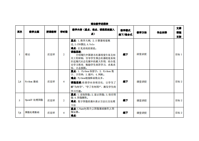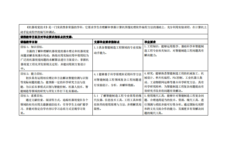 《机器视觉技术》教学大纲课避名称,机器视觉技术课忍类别(必修选修)事选修课程英文名称:Machine Vision Techndlogy总学时周学时学分,3222其中实险实戒学时,16先继课是:高等数学、线性代数、自动控制原理后续课程支撑毕业设计(论文)授课时间:1-16周星期三1-2节授裸地点:实605机房漫课对津:2022智能制造1班开裸学洗:粤台产业科技学院任课就师姓名淋:庄宏样/教授答展时间、地点与方式:L,每节课的课前、课间和课后,采用一对一的问答方式:2.每次习题课,采用集中讲解方式。课庭考被方试:开卷()闭港()课程论文()其它(√)非试港类报告使用被村:郭佳.《计算机视觉开发实战一基于0 penCV》.人民邮电出版社,2024做学事考资料:夏帮贵主编:《OpenCVi计算机视觉基础教程(Python版)(幕课版)》,人民邮电出版社,202L.课程情介:《机器视觉技术》是普通高等学校计算机科学、智能制造等技术专业的一门重要的专业基础课。通过本课程的学习,使学生能够在已有的计算机基础知识基础上,对计算机图像处理有一个系统的、全面的了解、为掌握计算机图像处理打下良好的基础:在系统理解和掌握计算机图像处理基本原理的基础上,了解和掌握计算机图像处理的基本原理和方法,具有设计和开发计算机图像处理软件的基本能力。