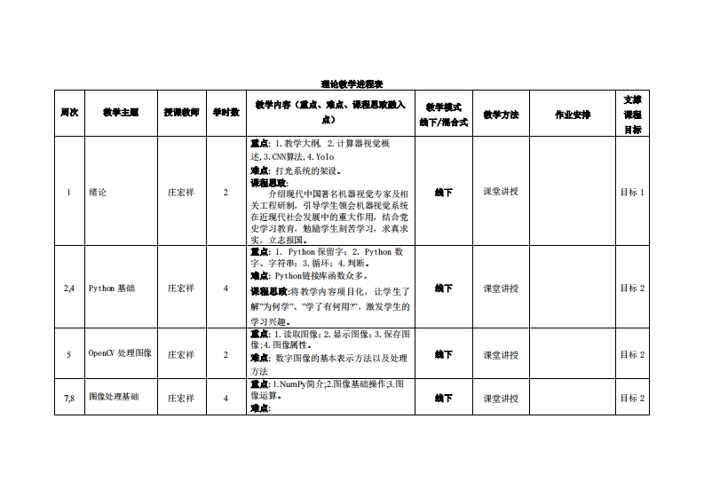 《机器视觉技术》教学大纲课避名称,机器视觉技术课忍类别(必修选修)事选修课程英文名称:Machine Vision Techndlogy总学时周学时学分,3222其中实险实戒学时,16先继课是:高等数学、线性代数、自动控制原理后续课程支撑毕业设计(论文)授课时间:1-16周星期一5-6节授裸地点:实605机房漫课对津:2022智能制造2班开裸学洗:粤台学院任课就师姓名淋:庄宏样/教授答展时间、地点与方式:L,每节课的课前、课间和课后,采用一对一的问答方式:2.每次习题课,采用集中讲解方式。课庭考被方试:开卷()闭港()课程论文()其它(√)非试港类报告使用被材:郭佳.《计算机视觉开发实战一基于0 penCV》.人民邮电出版社,2024数学事考资料:夏帮贵主编:《OpenCVi计算机视觉基础教程(Python版)(幕课版)》,人民邮电出版社,202L.课程情介:《机器视觉技术》是普通高等学校计算机科学、智能制造等技术专业的一门重要的专业基础课。通过本课程的学习,使学生能够在已有的计算机基础知识基础上,对计算机图像处理有一个系统的、全面的了解、为掌握计算机图像处理打下良好的基础:在系统理解和掌握计算机图像处理基本原理的基础上,了解和掌握计算机图像处理的基本原理和方法,具有设计和开发计算机图像处理软件的基本能力。