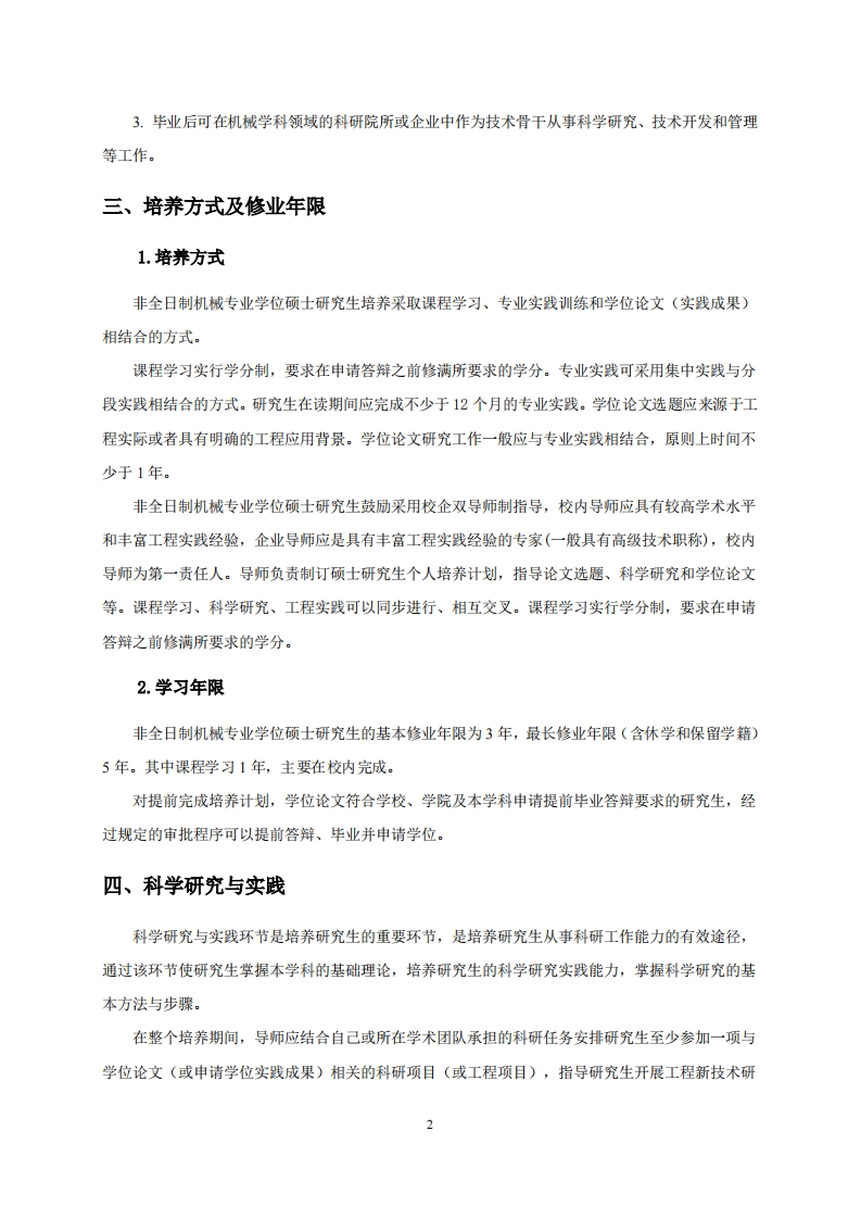 机械专业学位硕士培养方案(非全日制)(学科代码:085500授予机械硕士专业学位)机械与电子控制工程学院一、学科专业及培养方向北京交通大学机械硕士专业学位点依托我校机械工程学科设置,机械工程学科始建于1958年,1990年获车辆工程二级学科博士学位授予权,1996年评为铁道部重点学科,2003年获机械设计及理论二级学科博士学位授予权,2005年获机械工程一级学科博士学位授予权。2009年按照教育部的意见,设置机械工程全日制专业学位硕士点,并于当年开始招生。本学位点师资力量雄厚,导师承担多项国家、省部级以及企业委托重点、重大项目,与领军企业联系紧密,具备丰富的实践经验。课程设置针对机械工程职业分化越来越细、技术含量和专业化程度越来越高的特点,以实际应用为导向,以职业需求为目标,注重培养实践研究和创新能力,增长实际工程经验,缩短就业适应期限,提高专业素养及创新创业能力。主要研究方向及其内容:1.机械工程(1)智能装备技术与工程研究复杂零件精密加工、数字化与智能化制造技术及工程应用,研究机器人结构学、运动学与动力学分析与设计,新型操作机器人和移动机器人的创新设计、关键技术及其应用装备。研究纳米磁性液体和纳米润滑液的制备、性能表征及在航空航天军工等高端机械装备和生物医学等领域应用,研究摩擦磨损智能调控技术、磨损自修复技术、表面织构技术、涂层技术及装备。(2)机电系统智能测控技术与工程研究轨道交通、航空航天、能源电力、仿生机器人和智能无人系统等机电液一体化系统智能测控技术与工程应用:研究基于人工智能、机器视觉、无损检测和信号处理等智能检测技术与仪器:研究系统建模与辨识、状态评估与智能决策、数据驱动及优化控制、电液伺服系统传动控制和集成系统协同优化控制等工程应用:研究具有嵌入式系统、自主无人运行和物联网等特征的智能测控装备开发与应用。2。车辆工程(1)车辆结构可靠性设计技术与工程研究轨道车辆结构设计中的结构强度与疲劳可靠性问题,研究关键零部件的抗疲劳和防断裂设计技术和方法:研究轨道车辆零部件质量控制与服役可靠性问题:研究轨道车辆零部件失效分析与