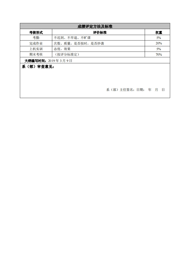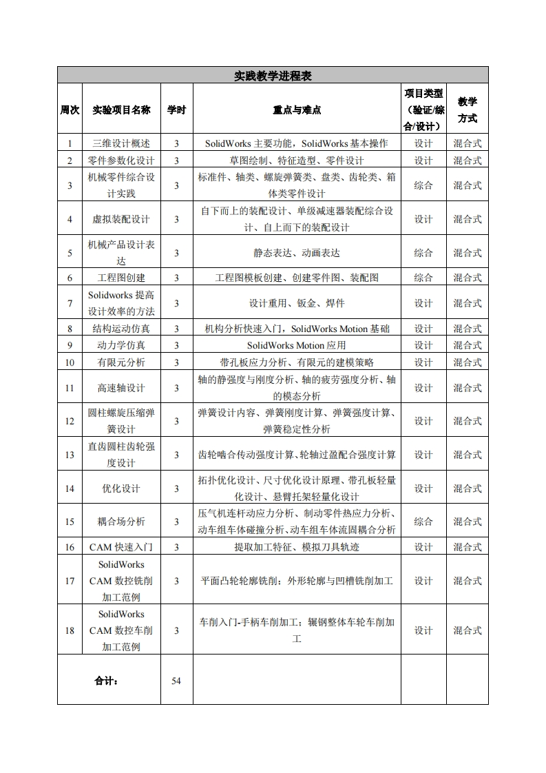 《机械制图2》课程教学大纲课程名称:机械制图2课程类别(必修/选修):必修课程英文名称:Mechanical Drawing2总学时/周学时/学分:48/3/3其中实验/实践学时:48先修课程:大学计算机基础、机械制图1授课时间:1至16周,周五5-7节授课地点:粤台产业科技学院机电楼401授课对象:2018精密制造1班开课学院:粤台产业科技学院任课教师姓名职称:评华饼师答疑时间、地点与方式:课前、课间和课后;教室;网络、交流。课程考核方式:开卷()闭卷()课程论文()其它()上机使用教材:《SolidWorks2018三维设计及应用教程》,商跃进,机械工业出版社。救学参考资料:L.《SolidWorks项目教程》,鲍仲辅,机械工业出版社:2.各精品资源共享课网站。课程简介:Solidworks是机械工程学科一门实操性较强的专业基础课程。本课程系统地介绍了计算机三维辅助机械设计的基本原理及实现方法。通过设计案例,以SolidWorks及其插件为平台,详细介绍了使用现代工具进行零件建模、虚拟装配、图纸绘制及产品展示等CAD技术,进行运动仿真和FEM分析的CAE技术以及进行数控铣削和车削编程的CAM技术。本课程主要任务是:使学生具有计算机辅助机械设计的基础知识,训练学生运用计算机进行机械设计的基本技能,为学生工作后适应现代化机械生产的需要打下良好的基础。课程教学目标本课程与学生核心能力培养之间的关联授课1.运用基本绘图命令绘制草图,零件图,装配图,对象为理工科专业学生的课程填写此栏):工程图:☑核心能力1.应用数学、基础科学和机械设计制造及其自动化专业知识能力:2.培养学生空间思维和分析问题的能力:口核心能力2.设计与执行机械设计制造及其3.培养学生的创新能力,形成独立开发的意识。自动化专业相关实验,以及分析与解释相关数据的能力:☑核心能力3.机械工程领域所需技能、技术以及实用软硬件工具的能力:口核心能力4.机械工程系统、零部件或工艺流程的设计能力:口核心能力5.项目管理、有效沟通协调、团队合作及创新能力:☑核心能力6.发掘、分析与解决复杂机械工程问题的能力:☑核心能力7.认识科技发展现状与趋势,了解工程技术对环境、社会及全球的影响,并培养持续学习的习惯与能力:口核心能力8。理职业道德、专业伦理与认知杜会责任的能力。