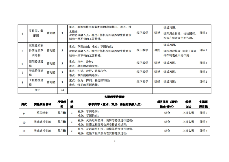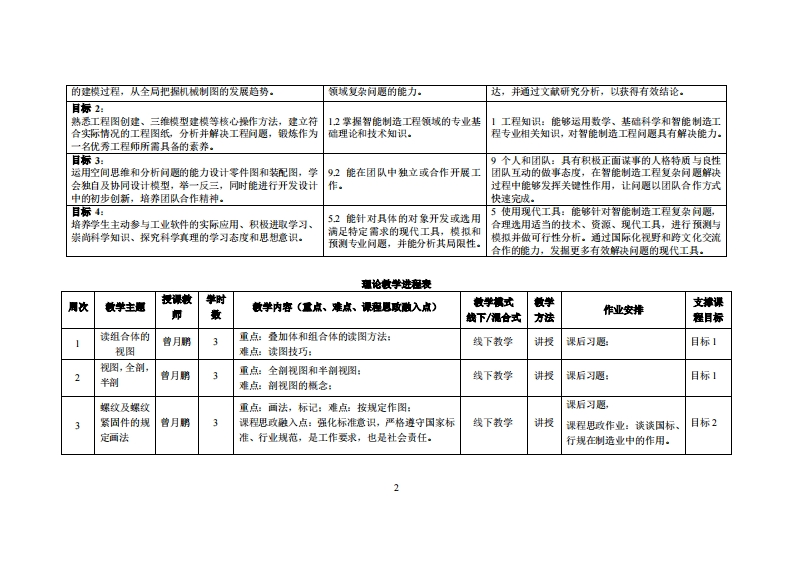 《机城制图2》教学大纲课避名称,机械制图2课和类别(必修选修)必修课程英文名称:Mechanical Graphics2总学时周学时学分,48型33其中实检实液学时,24先继课是:机械制图1后续课程支撑机械设计授餐课时间:3-6周周一9-11节:1-12周周三2-4节授课地点:机房503课对律:2023级智能制造工程1、2班开裸学洗:粤台产业科技学院任课放柳雉名淋:曾月鹏/刷教报答时间、地点与方式课前、课间和课后:教室、办公室:网络、面授解凝。课程考核方式:开卷()闭卷()课程论文()其它(√)上机使用藏材:SOLIDWORKS2023中文版机械设计从入门到精通,赵果杨晓晋赵楠,人民邮电出版社:妆学◆考资料:天工在线,s0idw0k2022从入门到精通,水利水电出版社,2022.课程情介:本课程以投影理论为基础和国家标准为依据,熟练应用S0S三维绘图软件创建模型:熟悉完整零件图各项要素:熟悉装配图的画法:掌握计算机二维绘图软件并能绘制零件图和装配图。机械图样由图形、符号、文字和数字等组成,是表达设计意图和制造要求以及交流经验的技术文件,常被称为工程界的语言。课程主要目的在于培养学生掌握空间分析能力、空间想象构形能力以及对空间几何问愿的图解能力:培养学生制图、读图的能力:培养学生具备工程素质及一丝不荷的工作态度,为后续的专业课学习和工程实践等莫定基础。课程妆学目标及对毕业要求州标点的支撑:课程放学目标支撑单业2要求指标点毕业要求目标1:22能熟练掌挥利用现代文献检索工2问愿分析:能够应用数学、自然科学和工程科学的攀挥平面图形,三视图,零件图,装配图等的读图及零件具调研、分析和解决智能制造工程基本原理,对于智能制造工程复杂问题进行识别与表