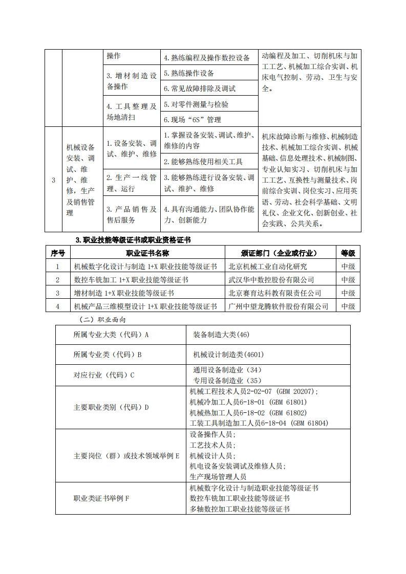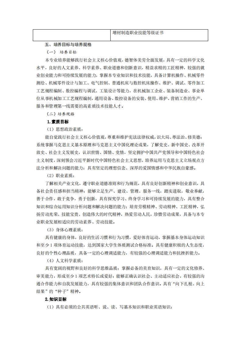 《机械制造及自动化》专业人才培养方案一、专业名称及代码专业名称:机械制造及自动化专业代码:460104二、入学要求招生对象:高中(中职)毕业生或具有同等学力者。招生类型:理科。三、修业年限三年。四、职业面向(一)职业能力分析1专业服务面向本专业毕业生主要到工业生产第一线从事机械制造领域内的设计制造、科技开发、应用研究、运行管理和经营销售等方面的工作,主要从事机电装备制造业,机械制图与计算机绘图,机械制造工艺与现场实施,机械设计与制造,增材制造设备操作与维护,机械加工与检测,机电设备安装、调试与维护,CAD/CAM技术运用等岗位工作。2.职业岗位与职业能力分析序工作岗位职业能力支撑课程号典型工作任务1.按照零件图1.能够识读零件图要求加工零件2.熟悉机床加工工艺范围1.熟悉机械零件设计理论机械制图、劳动、计算机辅助设2.机械零件设2.熟悉数字化设计与装配计、机械产品数字化设计与制机械零件计3.熟悉数字化仿真验证造、机械基础、机械加工综合实1设计及加训、切削机床与加工工艺、PLC工制造4.具备机械创新能力应用技术、互换性与测量技术、3.掌握机床加工步骤技巧机械制造技术、信息处理技术、2.对所加工零岗前综合实训、卫生与安全。4.熟练操作机床件进行测量、检验5.对零件测量与检验6.能查询相关文献资料数控编程与操作、数控加工实通用设备1.通用设备的1.掌握设备加工范围训、数控线切割技术、机械产品及数控设操作2.掌握设备加工步骤数字化设计与制造、机械制造备的使用2.数控设备的3.熟练操作通用设备技术、工程材料及热处理、UG自