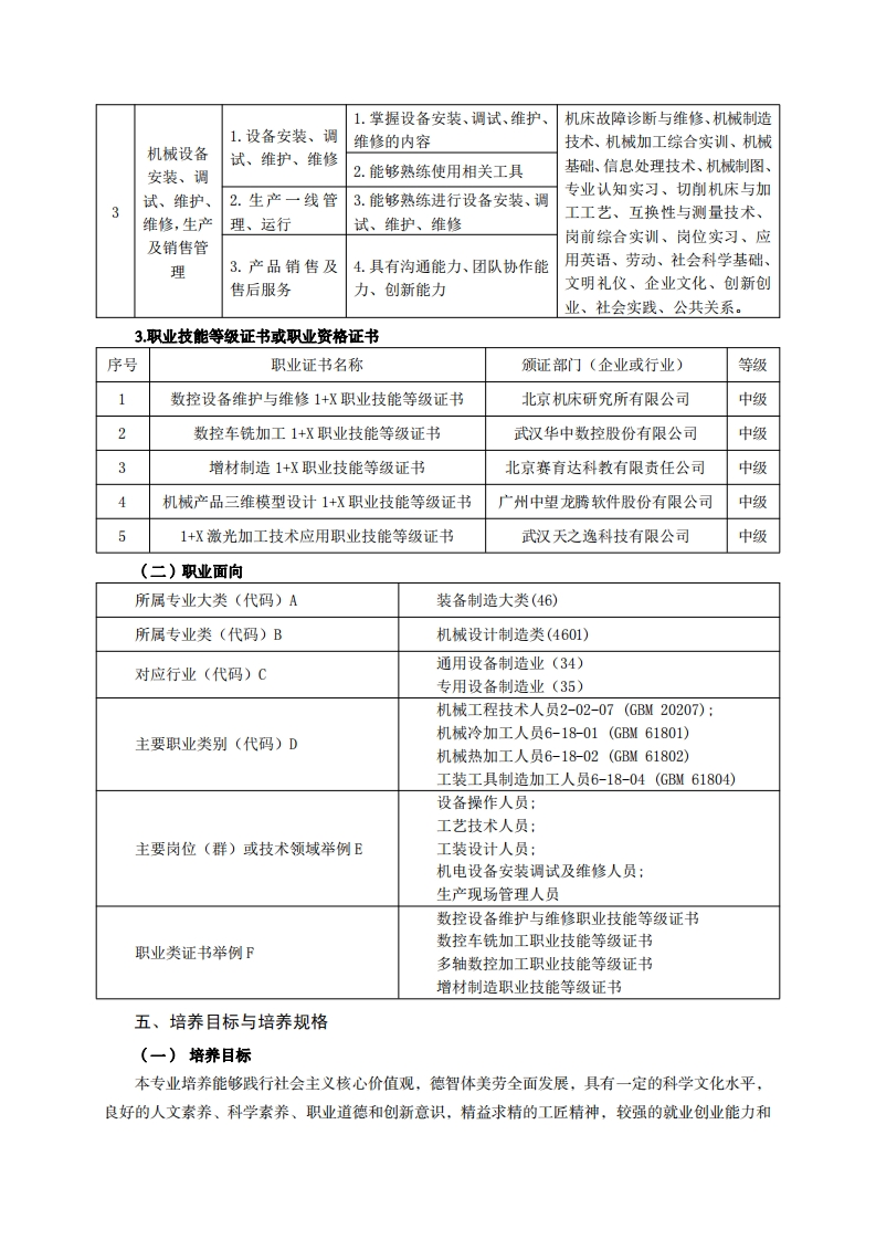 《机械制造及自动化》专业人才培养方案一、专业名称及代码专业名称:机械制造及自动化专业代码:460104二、入学要求招生对象:高中(中职)毕业生或具有同等学力者。招生类型:理科。三、修业年限三年。四、职业面向(一)职业能力分析1.专业服务面向本专业毕业生主要到工业生产第一线从事机械制造领域内的设计制造、科技开发、应用研究、运行管理和经营销售等方面的工作,主要从事机电装备制造业,机械制图与计算机绘图,机械制造工艺与现场实施,机械加工与检测,机电设备安装、调试与维护,CAD/CAM技术运用等岗位工作。2职业岗位与职业能力分析序号工作岗位典型工作任务职业能力支撑课程1.按照零件图1.能够识读零件图机械制图、劳动、计算机辅助设要求加工零件2.熟悉机床加工工艺范围计、工业产品造型设计、机械基机械零件3.掌握机床加工步骤技巧础、机械加工综合实训、切削的加工制2.对所加工零机床与加工工艺、PLC应用技造4.熟练操作机床件进行测量、检术、互换性与测量技术、机械验5.对零件测量与检验制造技术、信息处理技术、岗前综合实训、卫生与安全。6.能查询相关文献资料1.通用设备的1.掌握设备加工范围数控编程与操作、数控加工实操作2.掌握设备加工步骤训、数控线切割技术、机械制通用设备2.数控设备的3.熟练操作通用设备造技术、工程材料及热处理、及数控设UG自动编程及加工、切削机床备的使用操作4.熟练编程及操作数控设备与加工工艺、机械加工综合实3.工具整理及5.对零件测量与检验训、机床电气控制、劳动、卫场地清扫生与安全。6.现场“6S”管理