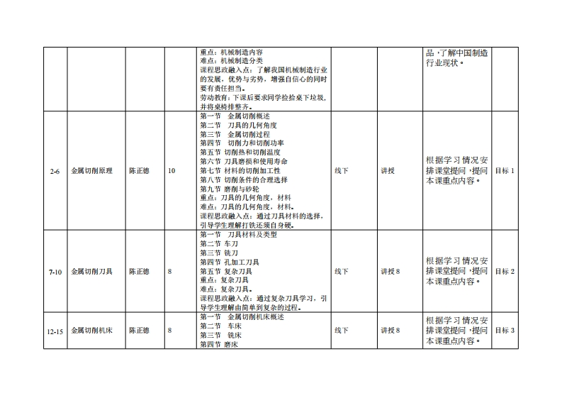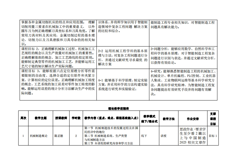 《机械制造技术基础》教学大纲课程名称:机械喇造技术盖璃课程类别(必修选修)多必修裸覆英文名称:Foundation of Machine Manufacturing Technology总学时/周学时/学分:32/22其中实验实陵学时:4先修课程:机械制图、理论力学、材料力学、金工实习后续课程支排:机电一体化系统设计授课时间:1-16周周一34节授课地点:教学楼6302浸裸对:2024智能制造工程1,2班开课学佛:粤台产业科技学院任裸放师姓名/麻:陈正德讲师答聚时间、地点与方式:课中课后、教学楼302、面答/微信群课程考核方式:开卷()闭卷()课程论文(√)其蛇()使用放材黄健求韩立发主编第3版,机械工业出版社出版社,2020年12月.放学◆考资料:1.张维合主编,北京理工大学出版社,2021年7月,课程简介:《机械制造技术基础》是机械类专业的一门专业基础课程。本课程的主要内容包括:机械加工方法、金属切削原理与刀具、机械加工工艺规程的制定、机床夹具设计、机械加工精度及其控制等内容。本课程针对机械专业的特点,以介绍有关机械制造技术的基础知识、基本理论和基本方法为主线,以培养学生分析和解决有关机械制造的基本能力为目标,力求使学生通过课程学习能够对机械制造技术有一个把握并具备实际运用能力,为后续专业课的学习、毕业设计以及毕业后从事生产和科学研究奠定坚实的理论与实践基础。课程教学目标及对毕业要求指标点的支撑:课程教学目标支撑毕业要求指标点华业要求课程目标1:正确理解传统机械加工方法的特点,1-3具备智能制造专业所需的知1-工程知识:能够运用数学、基础科学和智