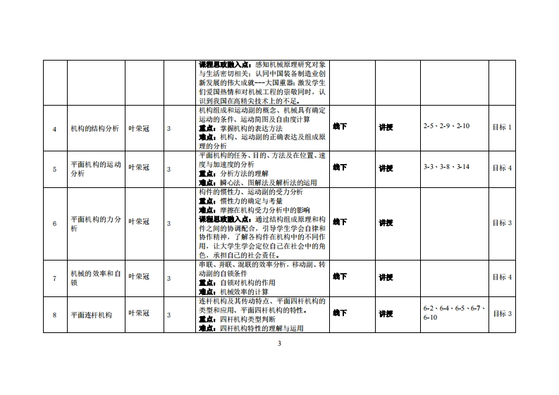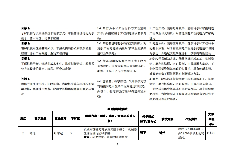 《机械原理》教学大纲裸寇名称:机械原理课和类别(必修选修),必修课程英文名称:Mechanism and Machine Theory总学时周学时学分,48型33其中实险实液学时,0先继课是:高等数学、工程制图、工程力学后续课程支撑机械设计、机械制造技术基础授课时间:2、418周1-3节授课地点:实验楼312课对津:2021智能制造工程2班开裸学洗:粤台产业科技学院任课就甲姓名琳:叶荣冠/副教授答时间、地点与方式:课后的一节课、实验楼307R、面答/微信群是考恢方式:开卷()闭卷(√)课程论文()其它()使用微村,徐楠王秀叶郭春洁等,机械原理(3D版),机械工业出版社,2022年7月。妆学事考资料:孙桓,机械原理(第9版),高等教育出版社,2021年5月。课程物介:《机械原理》为机类各专业中研究机械共性的一门主干技术基础课。它的任务在于使学生掌握机构学和机械动力学的基本理论、基本知识和基本技能,并初步具有拟定机械运动方案、分析和设计机构的能力。它在培养高级工程技术人才的全局中,具有增强学生对机械技术工作的适应能力和开发创造能力的作用。课程放学目标及对毕业要求指标点的支排:裸程妆学目标支撑毕业要求指标点单业要求