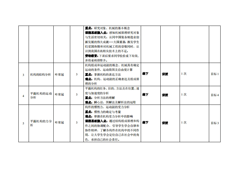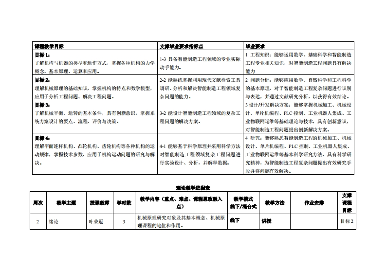 《机械原理》教学大纲裸避名称:机械原理课和类别(必修选修)·必修课程英文名称:Theory of Machines and Mechanisms总学时周学时学分,4833其中实检实减学时,4先继课是:高等数学、工程制图、工程力学后续课程支撑机械设计、机械制造技术基础漫课时间:2-17周星期二5-7节授课地点:莞城2208教室提课对津:2022智能制造工程1班开裸学桃:粤台产业科技学院任课救师姓名淋:叶荣冠/副教授答鞭时间、地点与方式:课后的一节课、实验楼307室、面答/微信课程考核方式:开卷()闭卷(√)课程论文()其它()使用微村徐楠王秀叶郭春洁等,机械原理(3D版),机械工业出版社,2020年1月。妆学净考查料:1.孙桓,机械原理(第9版),高等教育出版社,2021年5月。2.王晓力赵杰亮朱朋哲等,机械原理,清华大学出版社,2022年4月。课避情介:《机械原理》为机类各专业中研究机械共性的一门主干技术基础课。它的任务在于使学生掌握机构学和机械动力学的基本理论、基本知识和基本技能,并初步具有拟定机械运动方案、分析和设计机构的能力。在培养高级工程技术人才的全局中,具有增强学生对机械技术工作的适应能力和开发创造能力的作用。课程敢学目标及对毕业求指标点的支排