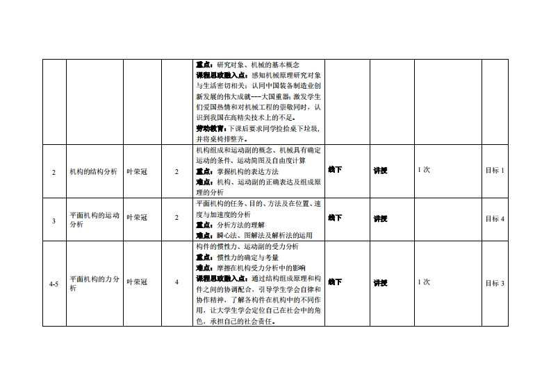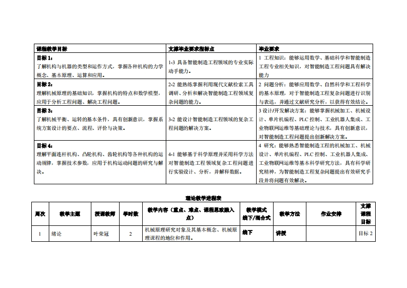 《机械原理》教学大纲裸名称:机械原理课和类别(必修选修),必修课程英文名称:Theory of Machines and Mechanisms总学时周学时学分,3222其中实险实液学时,4先修课塞:高等数学、机械制图后续课程支撑机械设计、机电一体化系统设计授课时间:1-16周星期五34节授课地点:莞城6409教室课对律:2023智能制造工程1,2班开裸学陕:粤台产业科技学院任课就甲姓名琳:叶荣冠/副教授答展时间、地点与方式实验楼307室、面答/微信课程考核方式:开卷()闭卷(√)课程论文()其它()使用微村徐楠王秀叶郭春洁等,机械原理(3D版),机械工业出版社,2020年1月。妆学考查料:1.孙桓,机械原理(第9版),高等教育出版社,2021年5月。2.王晓力赵杰亮朱用哲等,机械原理,清华大学出版社,2022年4月。课避情介:《机械原理》为机类各专业中研究机械共性的一门主干技术基础课。它的任务在于使学生掌握机构学和机械动力学的基本理论、基本知识和基本技能,并初步具有拟定机械运动方案、分析和设计机构的能力。在培养高级工程技术人才的全局中,具有增强学生对机械技术工作的适应能力和开发创造能力的作用。程教学目标及对单业要求指标点的文排