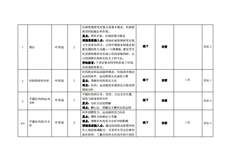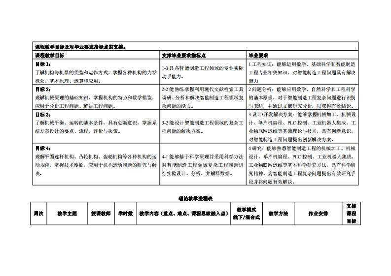 《机械原理》教学大纲裸程名称:机械原理课程类别(必修选修),必修课程英文名称:Theory of Machines and Mechanisms总学时周学时/学分,3222其中实险实戒学时:4先售课是:高等数学、机械制图后续课程支撑:机械设计、机电一体化系统设计授课时间:1-16周星期五3-4节授课地点:莞城61川教室望课对津:2024智能制造1,2班开课学洗:粤台产业科技学院任课敏即姓名职淋:叶荣冠/副教授答鞭时间、地点与方式:实验楼307室、面答/微信课程考核方式:开卷()闭卷(√)课程论文()其它()使用被材:徐楠王秀叶郭春洁等,机械原理(3D版),机械工业出版社,2025年2月,妆学◆考资料:1.孙桓,机械原理(第9版),高等教育出版社,2021年5月.2.王晓力赵杰亮朱用哲等,机械原理,清华大学出版社,2022年5月。课程简介:《机械原理》为机械类各专业中研究机械共性的一门主干技术基础课。它的目的在于使学生攀握机构学和机械动力学的基本理论、基本知识和基本技能,并初步具有拟定机械运动方案、分析和设计机构的能力·内容包括机构的结构分析、平面机构的运动及力分析、机械的效幸和自锁、平面连杆机构及其设计、凸轮机构及其设计、齿轮机构及其设计、轮系及其设计等。在培养高级工程技术人才的全局中,具有增强学生对机械技术工作的适应能力和开发创造能力的作用.