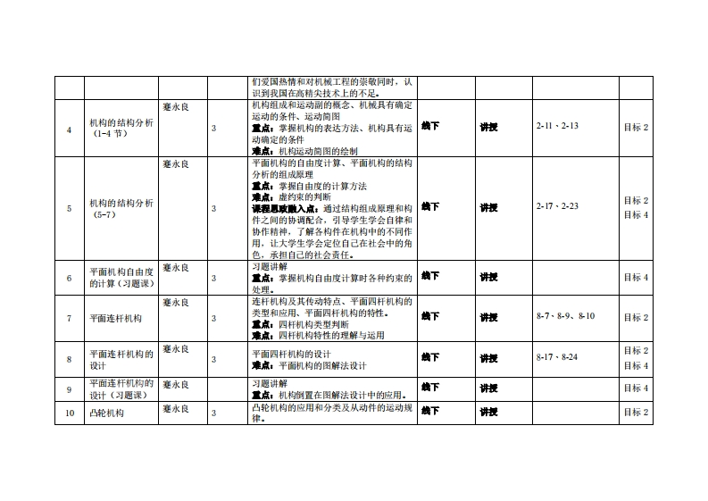《机械原理》教学大纲裸寇名称:机械原理课和类别(必修选修),必修课程英文名称:Mechanism and Machine Theory总学时周学时学分,48型33其中实险实液学时,0先继课是:高等数学、工程制图、工程力学后续课程支撑机械设计、机械制造技术基础授课时间:2、4-18周星期一10-12节授课地点:实验楼6306课对津:2021智能制造工程1班开裸学洗:粤台产业科技学院任课加姓名淋:蹇永良/副教报答展时间、地点与方式:课后的一节课、实验楼307R、面答/微信群课程考核方式:开卷()闭卷(√)课程论文()其它()使用微村,孙桓,机械原理(第9版),高等教育出版社,2021年5月。妆学事考资料:徐楠王秀叶郭春洁等,机械原理(3D版),机械工业出辰社,2022年7月。课程物介:《机械原理》为机类各专业中研究机械共性的一门主干技术基础课。它的任务在于使学生掌握机构学和机械动力学的基本理论、基本知识和基本技能,并初步具有拟定机械运动方案、分析和设计机构的能力。它在培养高级工程技术人才的全局中,具有增强学生对机械技术工作的适应能力和开发创造能力的作用。课程教学目标及对毕业要求指标点的支排:裸程妆学目标支撑单业要求指标点单业要求目标1:13具有力学和工程材料等工程基础】工程知识:能够运用数学、基础科学和智能制造了解机构与机器的类型和运作方式,掌握各种机构的分析知识,并能应用于工程问愿的求解和分工程专业相关知识,对智能造工程问愿具有解决