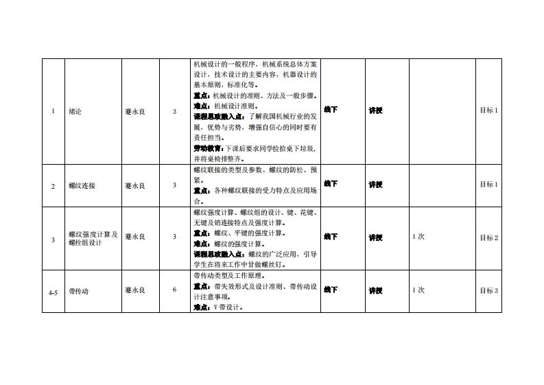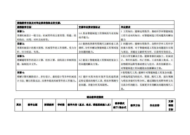 《机械设计》教学大纲课避名称:机械设计课和类别(必修选修)·必修课程英文名称:Mechanical Design总学时周学时学分,4833其中实检实液学时,12先课程:高等数学、工程制图、工程力学、机械原理后续课瘦支撑机械制造技术基础、机电一体化系统设计漫课时间:1-16周周三9-11节授课地点:教学楼6305提课对津:2021智能制造工程1班开裸学桃:粤台产业科技学院任课就师姓名淋:蹇永良/副教授答鞭时间、地点与方式课后的一节课、教学楼6305、面答/微信群是考方式:开卷()闭卷(√)课程论文()其它()使用微村濮良贵,机械设计第9版,高等教育出版社,2013年5月.妆学考查料:1.王军田同海何晓玲主编,机械设计课程设计,机械工业出版社,2018年2月。课避物介:《机械设计》是工科院校中机械类各专业的一门主干技术基础课。主要介绍机械中通用零部件的工作原理、结构特点、基本的设计理论和计算方法。它的任务是通过课堂教学、实验和课程设计使学生具有:设计通用零部件和简单机械系统的能力,对于机械工程问愿建立模型、分析求解和论证的能力,在机械工程实践中初步掌握并使用各种技术、技能和现代工程工具的能力。在培养高级工程技术人才的全局中,具有增强学生对机械技术工作适应能力和开发创造能力的作用。