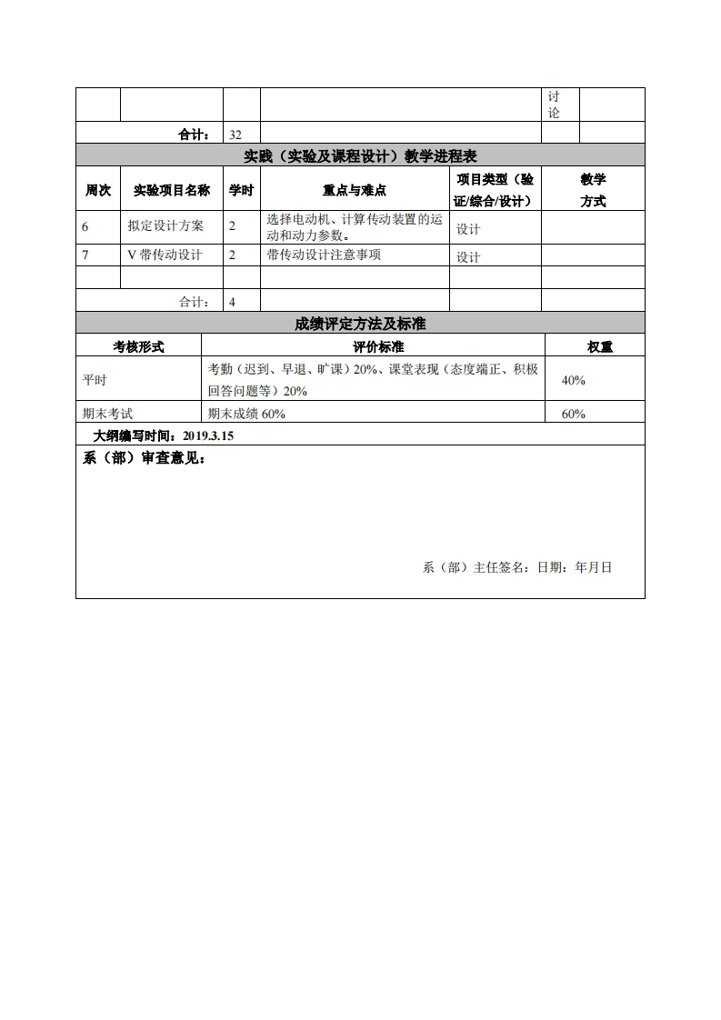 《机械设计》课程教学大纲课程名称:机械设计课程类别(必修/选修):必修课程英文名称:Mechanics Design总学时/周学时/学分:36/22其中实验/实践学时:4先修课程:机械制图、材料力学、机械原理等授课时间:1-18周周二5-6节授课地点:莞城救学楼6308授课对象:2017级精密制造开课学院:粤台学院机械系任课教师姓名职称:蹇永良副教授答疑时间、地点与方式:上课前后在上课散室答疑。课程考核方式:开卷()闭卷(√)课程论文()其它()使用教材:《机械设计》,濮良贵,高等教育出版社,2013年5月第9版。教学参考资料:《机械设计课程设计》李育锡,高等教育出版社课程简介:本课程机械设计课程是一门论述机械设计理论、研究通用零件机械设计方法,培养学生具有机械综合设计能力、实验及工程实践能力和创新能力的技术基础课。课程教学目标本课程与学生核心能力培养之间的关联授课对象为理工科专业学1.掌握的基本知识:机械设计一般方法,机械零件的主要类生的课程填写此栏):型、性能、结构特点、应用、材料及标准等。☑核心能力1.应用数学、基础科2.掌握的基本理论:机械设计的基本原则,机械零件的工作学和机械设计制造及其自动化专原理、受力分析、应力状态、失效。机械零件工作能力、计算准业知识能力:☑核心能力2.设计与执行机械设则、计算载荷、条件性计算、强度计算、当量法或等效转化法、试计制造及其自动化专业相关实算法。改普和提高机械零件的性能措施在设计中的应用。验,以及分析与解释相关数据的3.掌握的基本技能:设计计算,校核计算,结构设计和制图能力:☑核心能力3.机械工程领域所需技能,编制技术文件。技能、技术以及实用软硬件工具的能力:☑核心能力4.机械工程系统、零部件或工艺流程的设计能力:口核心能力5.项目管理、有效沟通协调、团队合作及创新能力;☑核心能力6.发据、分析与解决复杂机械工程问题的能力:☑核心能力7.认识科技发展现状与趋势,了解工程技术对环境、杜会及全球的形响,并培养持续学习的习惯与能力;口核心能力8.理解职业道德、专业伦理与认知社会责任的能力。