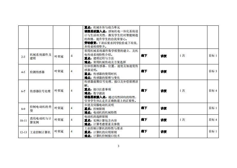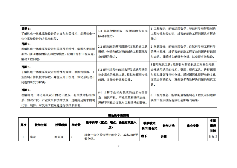 《机电一体化系统设计》教学大纲课避名称,机电一体化系统设计课和类别(必修选修),专业进修课程英文名称:Mechatronics System Design总学时周学时学分,3222其中实险实液学时,0先修课庭:机械原理、电工电子技术、机电传动与控制后续课程支撑专题制作、毕业设计授课时间:1-16周星期四34节授地点:莞城6308课对津:2021智能制造系1、2班开裸学陕:粤台产业科技学院任课就甲姓名琳:叶荣冠/副教授答时间、地点与方式课后的一节课、实验楼307R、面答/微信群课狸考楼方式:开卷()闭卷()课程论文()其它():报告使用微村,姜培刚,机电一体化系统设计(第2版),机械工业出版社,2021年9月。妆学事考资料:杨俊伟,机电一体化系统设计,机械工业出版社,2020年8月。课程物介:《机电一体化系统设计》课程是智能制造专业的进阶课城,是学生学习和掌握机电融合与应用知识的途径。通过本课程的教学,使学生了解机电一体化使然与必然,经由设计步骤掌握分析和使用各种机电器件与方法,理解机电一体化系统设计的思想,让学生系统地掌握机电一体化系统设计的基本原理和方法,灵活地运用相关技术进行机电一体化产品的分析、设计与开发,达到知识与能力的统一。课程放学目标及对毕业要求指标点的支排:裸程妆学目标支撑毕业雲求湘标点单业要球