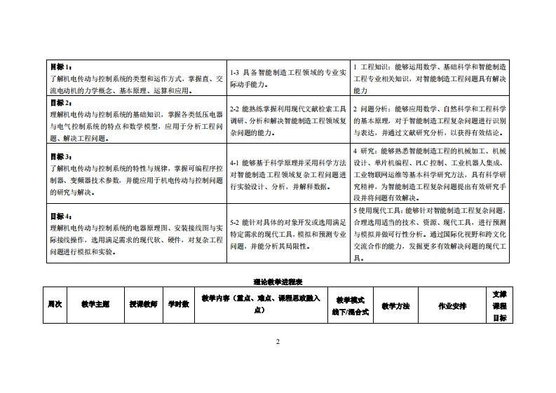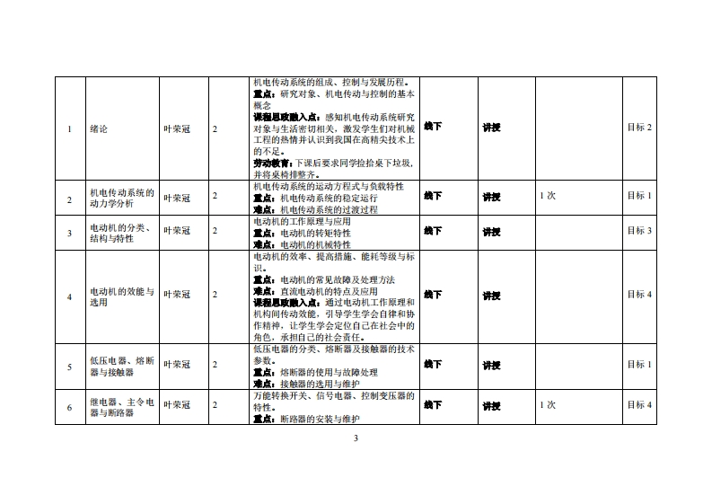 《机电传动与控制》教学大纲课避名称,机电传动与控制课和类别(必修选修),专业进修课程英文名称:旦ec女omechanical Drive and Control总学时周学时学分,3222其中实险实液学时,8先熊课是:高等数学、电工电子技术后续课程支撑机电一体化系统设计、无人机设计组装与制作授课时间:1-16周星期一1-2节授裸地点:莞城5303,机电楼204电工实验室课对津:2022智能制造系1、2班开裸学陕:粤台产业科技学院任课雉名淋:叶荣冠/刷教报答时间、地点与方式课后的一节课、实验楼307R、面答/微信群课程考核方式:开卷()闭卷()课程论文()其它():报告使用微村,凌永成,机电传动控制(第2版),机械工业出版社,2022年8月。妆学事考资料:程完平,机电传动控制(第5版),华中科技大学出版社,2021年6月。课程物介:《机电传动与控制》课程是智能制造专业人才所需电学知识结构的主体,是学生学习和掌握机电设备电气传动与控制知识的主要途径。通过本课程的教学,使学生了解机电传动控制的一般原理和基础知识,掌握分析、设计和使用机电传动控制系统和装置、器件的基本技能,获得机电工程师必备的知识储备和技能训练。课程放学目标及对毕业要求州标点的支排:课在妆学日标支撑毕业要求湘标点单业要求