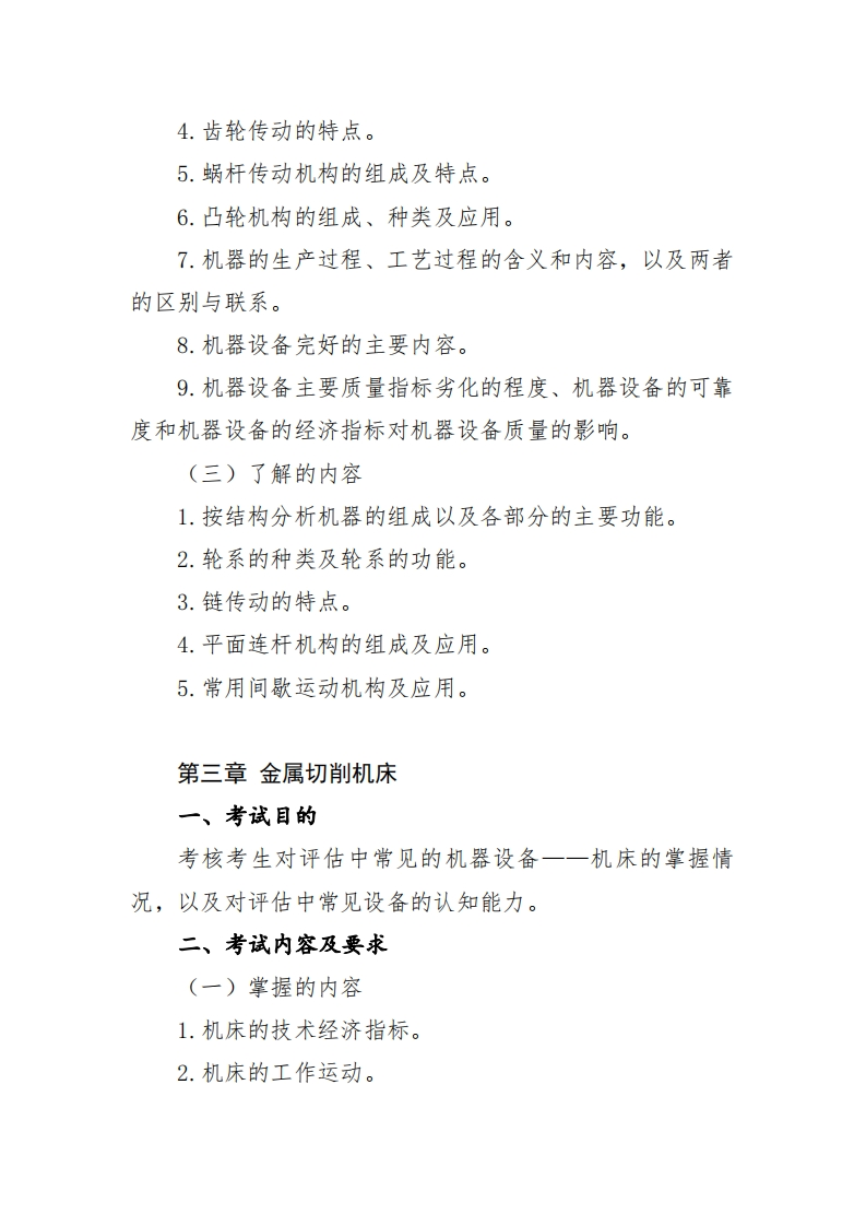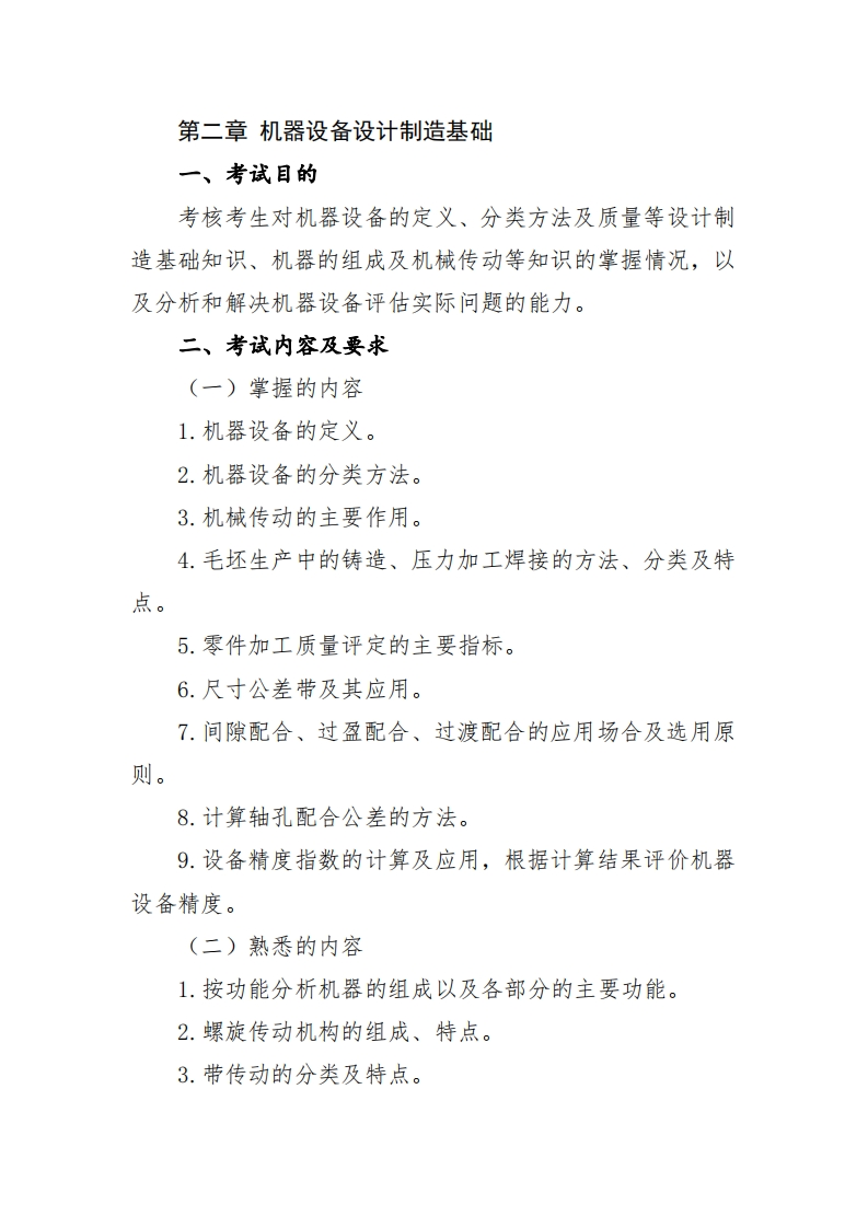 《机电设备评估》考试大纲第一章工厂概论一、考试目的考核考生对工厂相关基本概念、工厂生产流程及特点、技术经济指标内涵及评估应用、投资估算方法及其在评估中的作用等基础知识的掌握情况,以及对机器设备进行宏观、中观分析判断的能力。二、考试内容及要求(一)掌握的内容1.工厂的定义、分类。2.工厂生产流程及特点。3.三种典型工厂投资估算方法的特点。(二)熟悉的内容1.工厂投资构成。2.常见工厂与设备技术经济指标。3.三种典型工厂投资估算方法的应用。(三)了解的内容1.几种常见行业工厂的生产流程与设备配置特点。2.工厂的生产能力。3.工厂设计资料及评估中的作用。4.技术经济指标含义及评估应用。