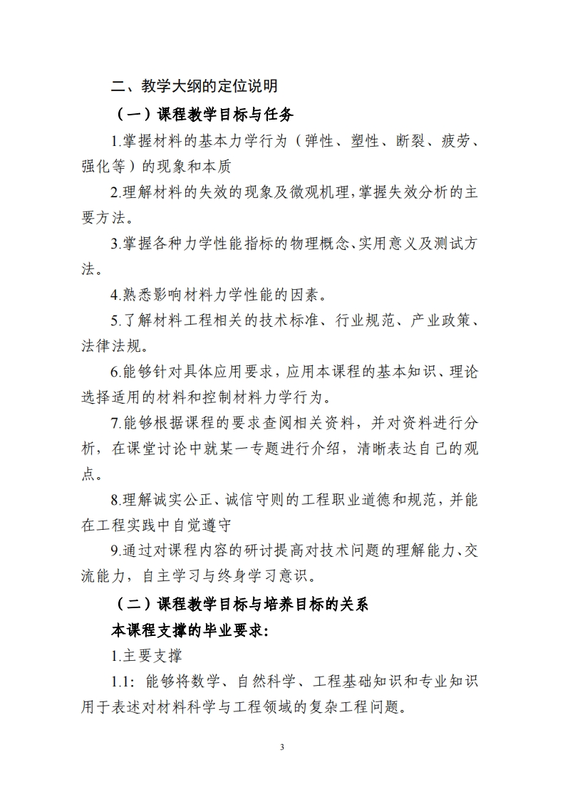《材料力学性能》课程教学大纲一、课程概况课程名称材料力学性能课程号1412065课程英文名称Mechanical Properties of Materials学时/学分36/2课程性质必修适用专业材料物理课程负责人彭鹏教学团队徐远丽选用散材及1.材料的力学性能,郑修麟,西北工业大学出版社,2000年:参考书目2.工程材料力学性能,刘瑞堂等,哈尔滨工业大学出版社,2001年课程简介:本课程着重介绍材料力学性能的基本理论,评价材料的各种力学性能的指标,测定原理与方法,失效机理与失效准则及其工程实用意义。使学生掌握材料力学性能的基本概念、基本原理和测试材料力学性能的基本方法,探讨改善材料力学性能的基本途径,提高分析材料力学性能的思维能力,为研究开发和应用工程材料打下基础。课程目标(Course Objectives,,CO)1掌握材料的基本力学行为(弹性、塑性、断裂、疲劳、强化等)的现象和本质知识目标(C01)2理解材料的失效的现象及微观机理,掌握失效分析的主要方法。3掌握各种力学性能指标的物理概念、实用意义及测试方法。4熟悉影响材料力学性能的因素。5.了解材料工程相关的技术标准、行业规范、产业政策、法律法规6能够针对具体应用要求,应用本课程的基本知识、理论选择适用的材料和控制材料力学行为。能力目标(C02)7能够根据课程的要求查阅相关资料,并对资料进行分析,在课堂讨论中就某一专题进行介绍,清晰表达自己的观点。8.理解诚实公正、诚信守则的工程职业道德和规范,并能在工程实素质、情感价值观目标(CO3)践中自觉遵守9通过对课程内容的研讨提高对技术问题的理解能力、交流能力,自主学习与终身学习意识。NPM1讲授法教学学时90%过PM2研讨式学习学时10%教学方式(PedagogicaloPM3案例教学学时%oPM4翻转课堂学时%Methods.PM)oPM5混合式教学学时%oPM6体验式学习学时%考核方式考(Evaluation试NEMI课程作业30%DEM2单元测试%NEMB课堂辩论10%Methods.EM)课