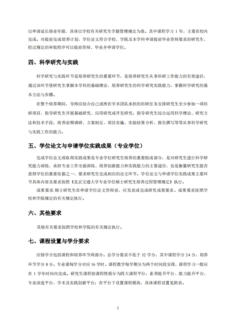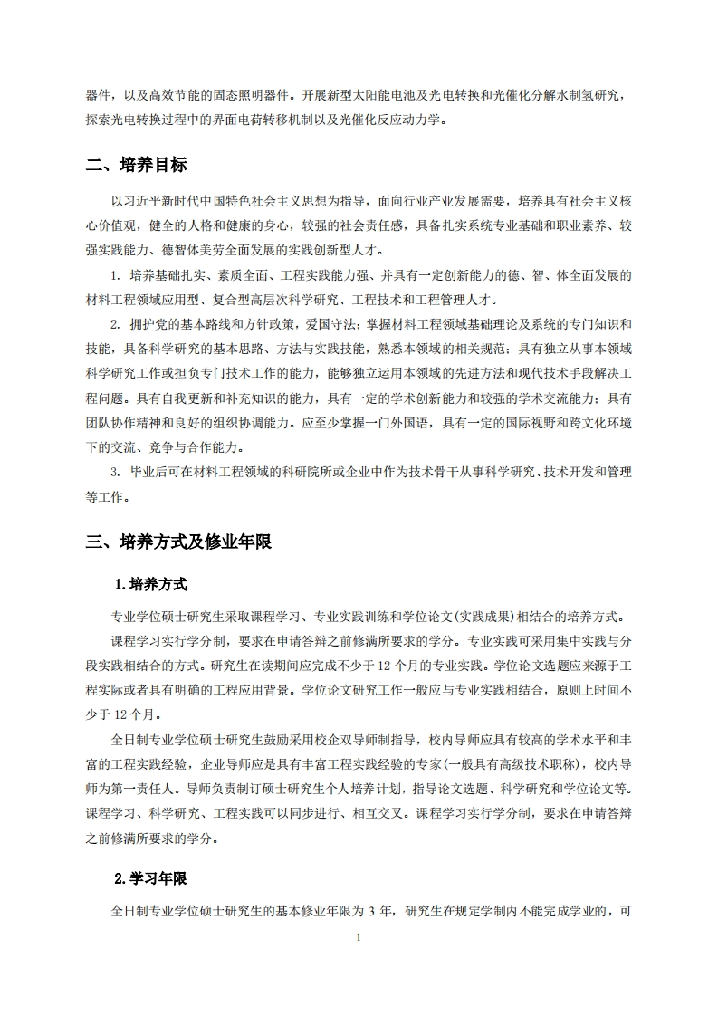 材料工程专业学位硕士培养方案(学科代码:085601授予材料与化工硕士专业学位)物理科学与工程学院、机械与电子控制工程学院一、学科专业及培养方向材料工程是研究、开发、生产和应用金属材料、无机非金属材料、高分子材料和复合材料的工程领域。材料工程专业领域主要围绕国民经济和国防建设需求,开展各种先进材料及零部件的设计、制备、表征及应用的理论和技术研究。北京交通大学材料工程硕士专业学位点依托我校材料科学与工程学科设置,以先进轨道交通和装备制造为主要工程研究背景和应用方向,在轨道交通用先进钢铁材料、导电陶瓷及其复合材料、高性能金属及其复合材料、材料先进成形工艺等研究领域具有鲜明的特色,推动新材料、新技术和新产品的产业化应用。学位点师资力量雄厚,承担了多项国家、省部级以及企业委托项目,与企业联系紧密,实践经验丰富。学位点以实际工程应用为导向,以职业需求为目标,注重培养实践研究和创新能力,增长实际工作经验,缩短就业适应期限,提高专业素养及就业创业能力。主要研究方向及其内容1.先进交通材料开发与应用研究面向交通领域应用的先进金属材料、先进复合材料、材料先进成形工艺及材料表面技术,开展先进金属材料在轨道交通领域中轨道及车辆制造等部件的应用研究:开展导电陶瓷及其复合材料在高速列车受电弓滑板、刹车片等部件的应用研究:开展金属液态模锻、半固态成形及一体化成形、增材制造等先进成形工艺在先进轨道交通与装备制造等领域的应用研究:开展磁性液体、磁流变液在密封、减振、传感器等部件的应用研究:开展电磁屏蔽、隐身吸波等结构功能一体化复合材料制备与应用研究。2.材料智能设计、制造及运用研究材料成分、制备与加工工艺、微观组织和服役性能之间的内在关系及其调控技术,开展计算材料学、材料凝固及成型数值模拟、材料基因工程、大数据分析、机器学习、人工智能等新技术在先进材料设计与制备中的应用研究。3.光电材料与器件制备及应用有机、无机光致和电致发光材料的设计、制备、表征及性质研究:开展发光、导电、液晶及特种光学功能材料的制备及应用研究。探究材料在不同外界刺激(如温度、电场、磁场、光照)下的性能演变规律,实现材料在光学信息存储、柔性电子器件等多领域的应用。开展新型发光显示材料和器件研究,制备性能优异的有机发光二极管(OLED)、量子点发光二极管(QLED)等新型显示