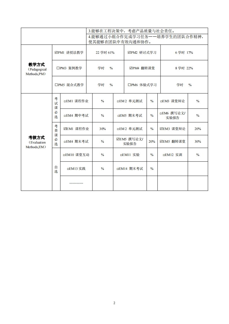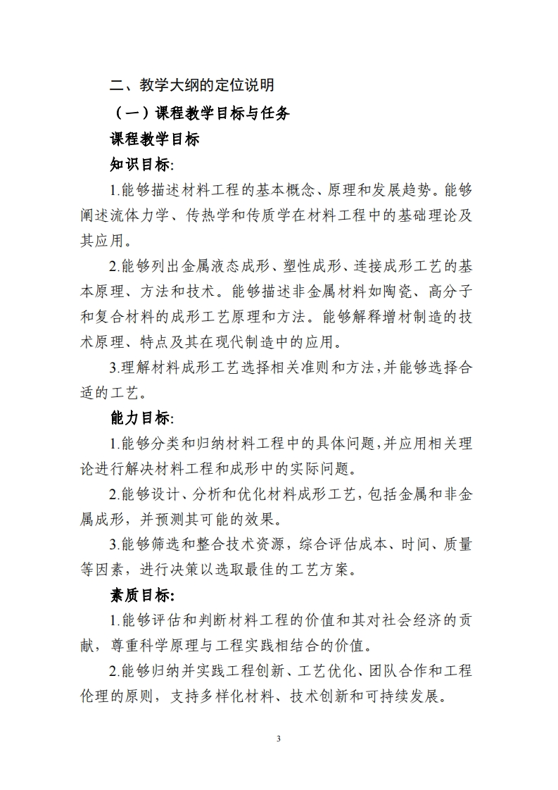 《材料工程基础》课程教学大纲一、课程概况课程名称材料工程基础课程号1412060课程英文名称Fundamentals of MaterialsEngineering学时/学分36/2课程性质必修适用专业材料化学课程负责人赵争妍教学团队王希成《材料工程基础要览》师昌绪、钟群鹏、李成功主编化学工业出版社:《材料工程基础》周美玲、谢建新、朱宝泉主编北京工业大学出版社:《材料工程基础》徐德龙、选用教材及谢峻林主编武汉理工大学出版社:《材料工程基础》(美)唐纳德·R·阿斯克兰德、参考书目(美)文德林·J·莱特著科学出版社:《Fundamentals of Material Science andEngineering》(5 h Edition英文影印版)William D.Callister Jt.化学工业出版社:《材料成形技术基础》于爱兵主编清华大学出版社:《材料成形技术基础》周志明、涂坚、盛旭敏主编化学工业出版社课程简介:《材料工程基础》是材料化学专业的一门专业核心课,为学生提供一个系统而深入地了解材料工程领域的平台。本课程将详细探讨从基础到先进的金属与非金属材料的成形技术、连接技术,以及创新的增材制造(3D打印)应用。此外,学生还将探索流体力学、传热学和传质学如何在材料工程中发挥其关键作用。课程的目标是培养学生的理论知识和实践技能,使其能够有效地应对实际工程中的挑战,同时重视工程伦理和社会责任。经过综合性评估,确保每位学生都能够全面掌握并应用所学知识。简言之,本课程不仅旨在为学生打下坚实的材料工程基础,培养其综合工程思维,更期望培养出富有责任感、具备高度分析能力的高素质人才。课程目标(Course Objectives,,CO)1.能够描述材料工程的基本概念、原理和发展趋势。能够阐述流体力学、传热学和传质学在材料工程中的基础理论及其应用。2.能够列出金属液态成形、塑性成形、连接成形工艺的基本原理、知识目标(C01)方法和技术。能够描述非金属材料如陶瓷、高分子和复合材料的成形工艺原理和方法。能够解释增材制造的技术原理、特点及其在现代制造中的应用。3.理解材料成形工艺选择相关准则和方法,并能够选择合适的工艺。1.能够分类和归纳材料工程中的具体问题,并应用相关理论进行解决材料工程和成形中的实际问题。能力目标(C02)2能够设计、分析和优化材料成形工艺,包括金属和非金属成形,并预测其可能的效果。3能够筛选和整合技术资源,综合评估成本、时间、质量等因素,进行决策以选取最佳的工艺方案。1.能够评估和判断材料工程的价值和其对社会经济的贡献,尊重科学原理与工程实践相结合的价值。素质、情感价值观目标(CO3)2.能够归纳并实践工程创新、工艺优化、团队合作和工程伦理的原则,支持多样化材料、技术创新和可持续发展。