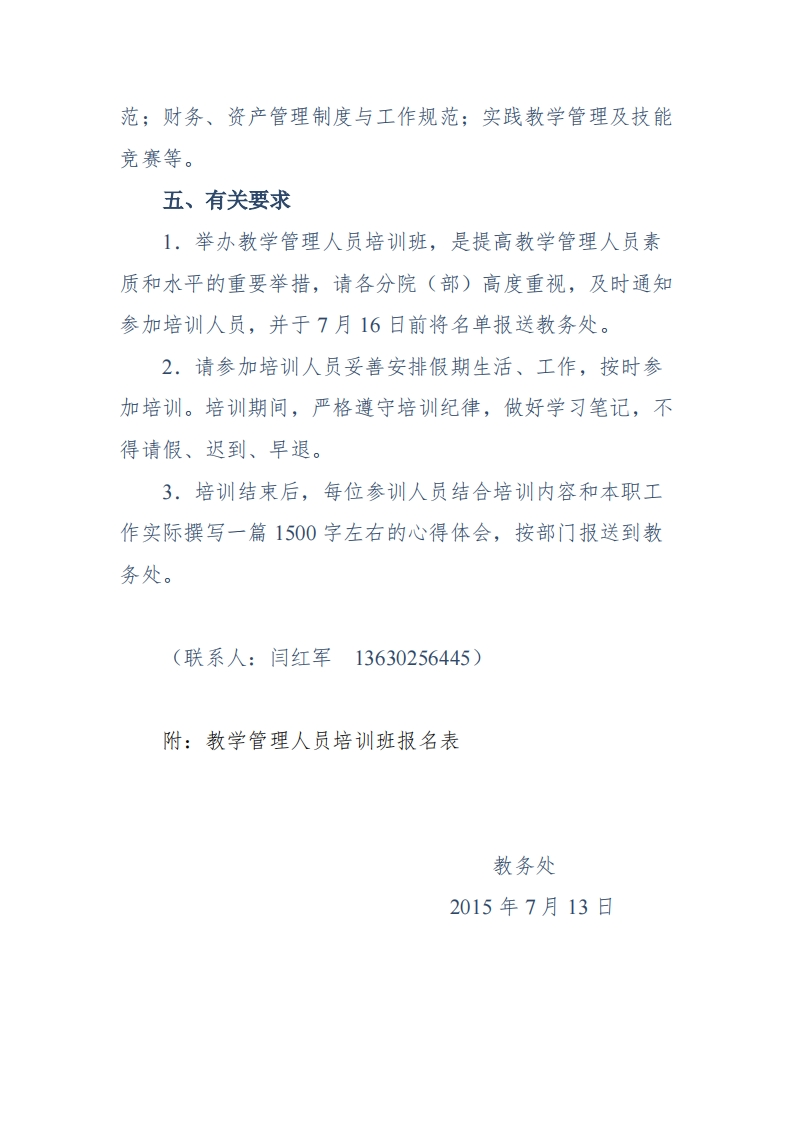 杨凌职业技术学院关于举办2015年暑期教学管理人员培训川班的通知各分院(部):为进一步提高教学管理人员的理论素养、业务能力及管理水平,促进教学管理队伍职业化、专业化、科学化发展。经研究,学院决定举办2015年暑期教学管理人员培训班。现将有关事项通知如下:一、培训对象各分院(部)教研室主任、办公室主任、办公室工作人员,教务处工作人员。二、培训时间、地点时间:2015年8月22一24日地点:水韵楼三楼会议室三、培训方式根据我院教学管理工作的特点和要求,采取专题讲座、专题研讨、经验交流方式进行四、培训内容培训内容主要包括:教研室建设与管理;人才培养方案的制定原则与方法;专业建设与课程建设;教学质量管理;教务日常运行管理与信息化建设;教学管理制度与工作规