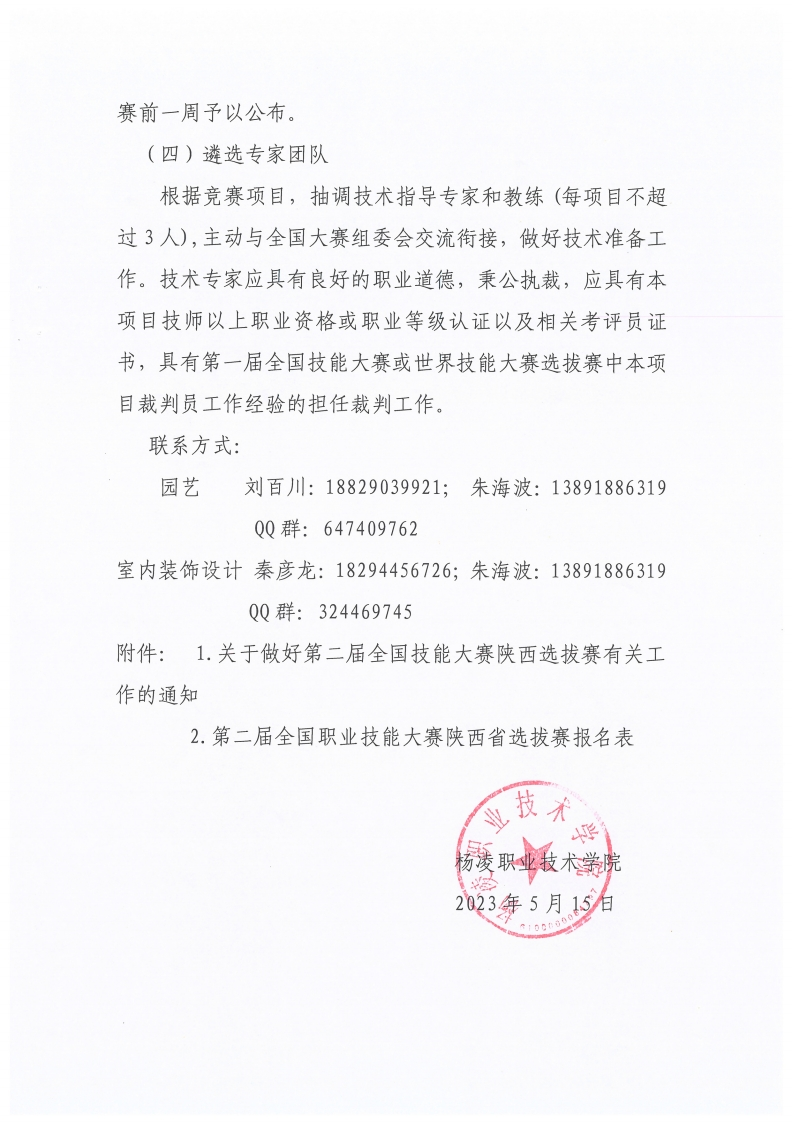 杨凌职业技术学院关于举办第二届全国技能大赛园艺和室内装饰设计项目陕西选拔赛的通知各有关单位:根据陕西省人力资源和社会保障厅《关于做好第二届全国技能大赛陕西省选拔赛有关工作的通知》(陕人社函[2023]150号])要求,杨凌职业技术学院承担第二届全国技能大赛园艺和室内装饰设计项目陕西选拔赛。现就有关事项通知如下:一、竞赛时间和地点时间:6月上句(具体时间在大赛群内通知)地点:杨凌职业技术学院西校区二、竞赛组织主办单位:陕西人力资源和社会保障厅承办单位:杨凌职业技术学院三、参赛事项(一)参赛条件1.园艺项目凡2002年1月1日以后出生,思想品德优秀,具备园艺专业领域扎实基本功和技能水平,具有较强学习能力、应变能力以及较好身体素质、心理素质的人员,均可报名参赛。2.室内装饰设计凡2007年1月1日以前出生,思想品德优秀,具备室