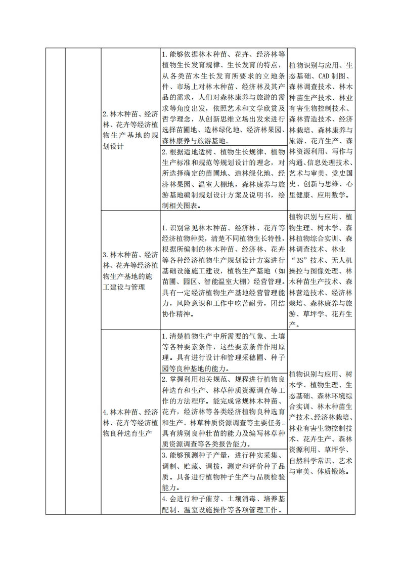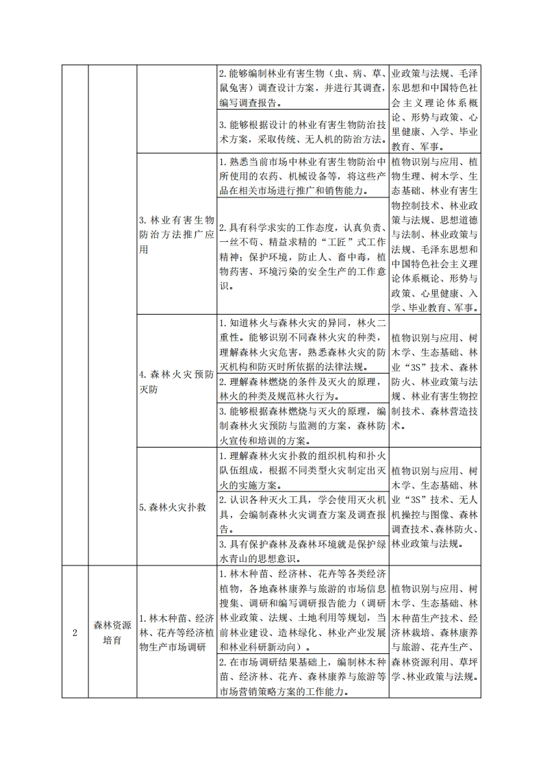 《林业技术》专业人才培养方案一、专业名称及代码专业名称:林业技术专业专业代码:410201二、入学要求招生对象:高中(中职)毕业生或具有同等学力者。招生类型:文理兼收。三、修业年限三年。四、职业面向(一)职业能力分析1.专业服务面向本专业主要培养在各级林业局、林业技术推广站、苗木繁育基地、农林科技公司、林业类信息技术公司等单位的森林资源保护与管护、森林资源培育、林业调查规划设计等岗位上从事森林病虫害调查、测报和监测、防治及药械营销,苗圃基地经营管理和林木种苗生产及销售,古树名木保护,各类人工林和工业原料林营造、乡土树种、珍稀树种和大径级用材林的培育及生态环境修复,森林抚育、低效林改造提升等森林经营,森林资源调查与监测、森林资源管理和管护、森林经营方案编制、专项森林资源调查、林业规划设计等工作。2.职业岗位与职业能力分析序号工作岗位典型工作任务职业能力支撑课程1.识别常见森林昆虫和外来入侵昆虫,掌握其生长发育规律,具有进行昆虫标植物识别与应用、树本采集与制作、鉴定的能力。木学、林业有害生物1.林业有害生物2.识别常见林木病害和和外来入侵植物控制技术、林业政策识别病害,危害寄主,具有进行林木病害标与法规、岗位实习、本采集、制作与鉴定能力。体质锻炼、劳动、早森林资源3.识别其他有害生物如鼠害、杂草,其操保护危害特征。1.会根据林业有害生物危害特征进行准植物识别与应用、树2.林业有害生物确判断,提出综合防治技术措施(如所木学、生态基础、林使用的药剂种类、配制方法等能力)。业有害生物控制技防治具有编制林业常见有害生物防治技术方术、林业政策与法规、案的能力。思想道德与法制、林