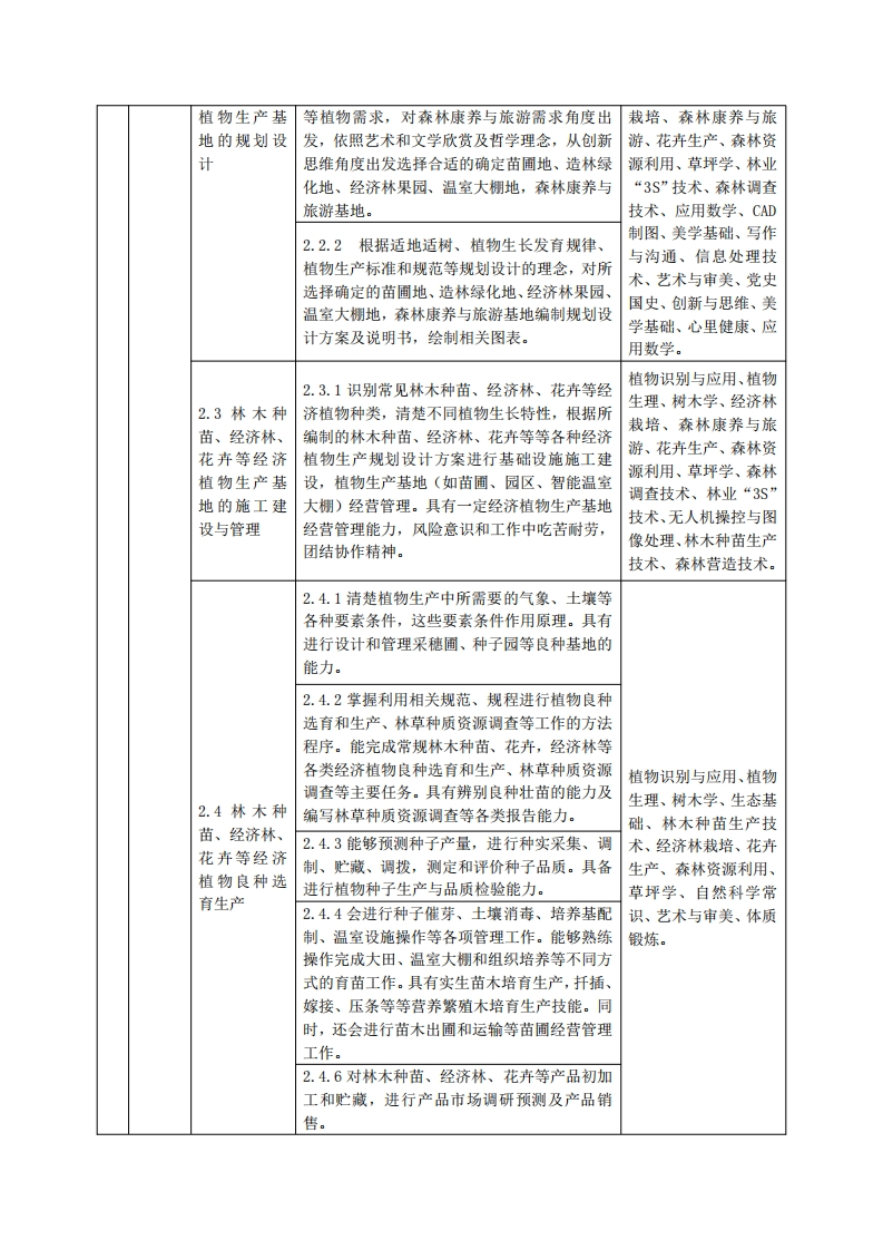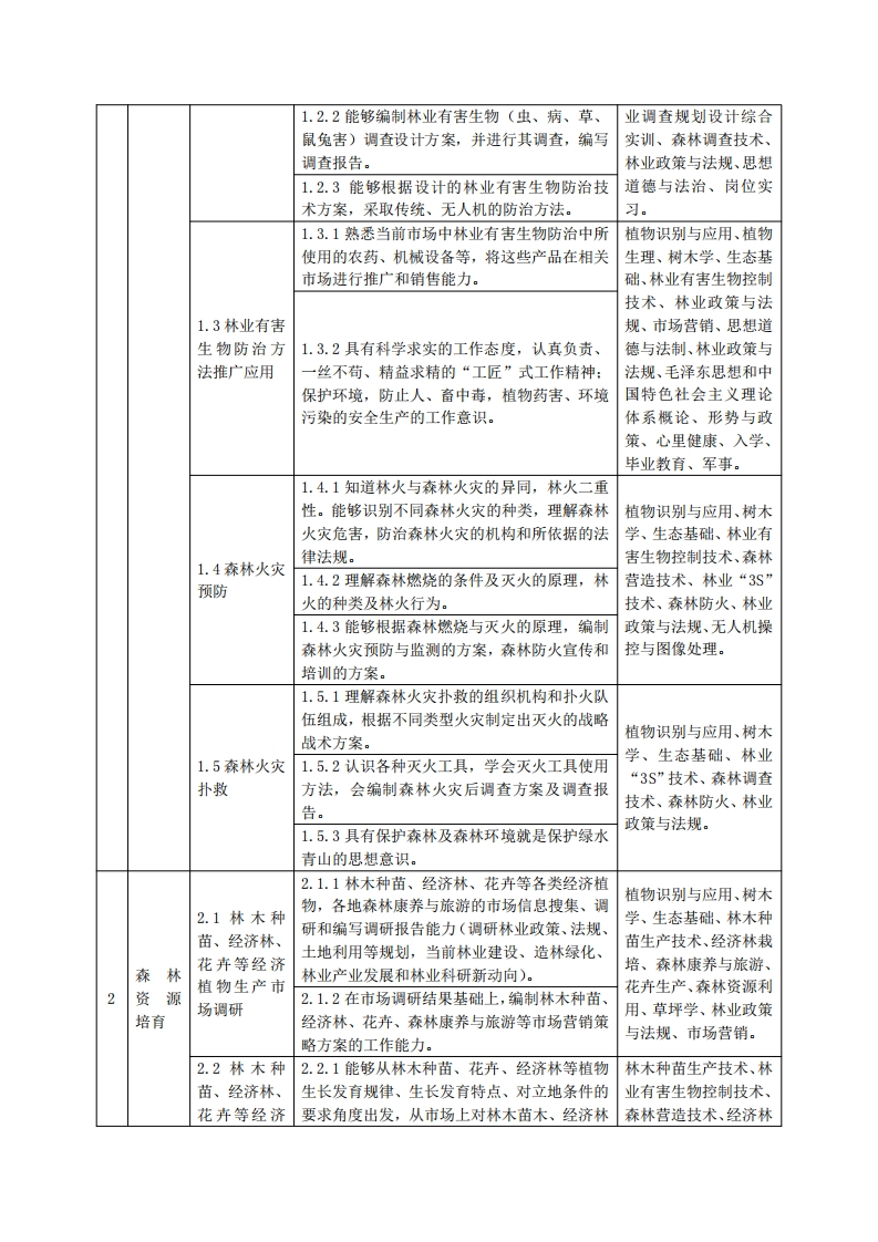 《林业技术》专业人才培养方案一、专业名称及代码专业名称:林业技术专业代码:410201二、入学要求招生对象:高中(中职)毕业生或具有同等学力者。招生类型:理科/文史/文理兼收。三、修业年限三年。四、职业面向(一)职业能力分析1.专业服务面向本专业主要培养在各级林业局、林业技术推广站、苗木繁育基地、农林科技有限公司、林业类信息技术公司等单位的森林资源保护与管护、森林资源培育、林业调查规划设计等岗位上从事森林病虫害调查、测报和监测、防治及药械营销,苗圃基地经营管理和林木种苗生产及销售,各类人工林和工业原料林营造、乡土树种、珍惜树种和大径级用材林的培育及生态环境修复,森林抚育、低效林改造提升等森林经营,森林资源调查与监测、森林资源管理和管护、森林经营方案编制、专项森林资源调查等林业规划设计工作。2职业岗位与职业能力分析序工作典型工作号职业能力支撑课程岗位任务1.1.1识别常见森林昆虫和外来入侵昆虫,掌握其生长发育规律,具有进行昆虫标本采集与制作、鉴定的能力。植物识别与应用、树木学、林业有害生物控制1.1林业有害1.1.2识别常见林木病害和和外来入侵植物病技术、林业政策与法生物识别害,危害寄主,具有进行林木病害标本采集、森林规、岗位实习、体质锻制作与鉴定能力。1资源炼、劳动、早操。保护1.1.3识别其他有害生物如鼠害、杂草,其危害特征。1.2.1会根据林业有害生物危害特征进行准确植物识别与应用、树木1.2林业有害判断,提出综合防治技术措施(如所使用的药学、生态基础、林业有生物防治剂种类、配制方法等能力)。具有编制林业常害生物控制技术、无人见有害生物防治技术方案的能力。机操控与图像处理、林