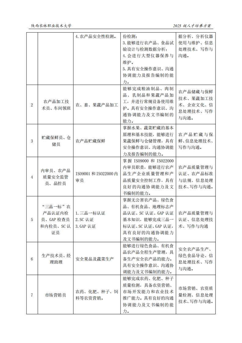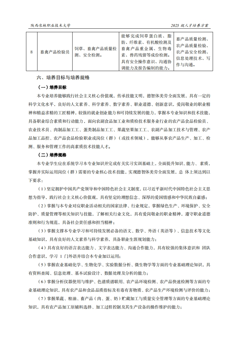 陕西农林职业技术大学2025级人才培养方案《农产品加工与质量检测》专业人才培养方案(普通三年制)一、专业名称(专业代码)农产品加工与质量检测(410114)二、入学基本要求招生对象:中等职业学校毕业、普通高级中学毕业或具备同等学力。招生类型:物理类、历史类兼收。三、基本修业年限三年。四、职业面向所属专业大类(代码)A农林牧渔大类(41)所属专业类(代码)B农业类(4101)对应行业(代码)C农副食品加工业(13)质检技术服务业(745)农产品食品检验员(4-08-05-01)农业技术员(5-05-01-01制米工(6-01-01-01)制粉工(6-01-01-02)主要职业类别(代码)D制油工(6-01-01-03)肉制品加工工(6-01-04-03)蛋类制品加工工(6-01-04-04)果蔬坚果加工工(6-01-06-00)农副产品加工技术与管理主要岗位(群)或技术领域举例E农产品加工品控农产品食品检验农产品食品检验员职业类证书举例F1+X食品合规管理1+X可食食品快速检测五、职业岗位与职业能力分析序号工作岗位典型工作任务职业能力支撑课程1.样品前处理及标准1.能够完成被检农产品样农产品质量检测、化验员、质检员、溶液配置:品前处理:农产品生产环境检仪器维护员、环2.农产品产地环境检2.能够完成农产品产地环测、粮油质量检测、境检测员、粮油测与评价:境中大气、水质、土壤等指畜产品质量检测、检验员3.农产品品质分析检标检测与评价:食品微生物及检2.能够进行农产品营养成测、试验设计与数