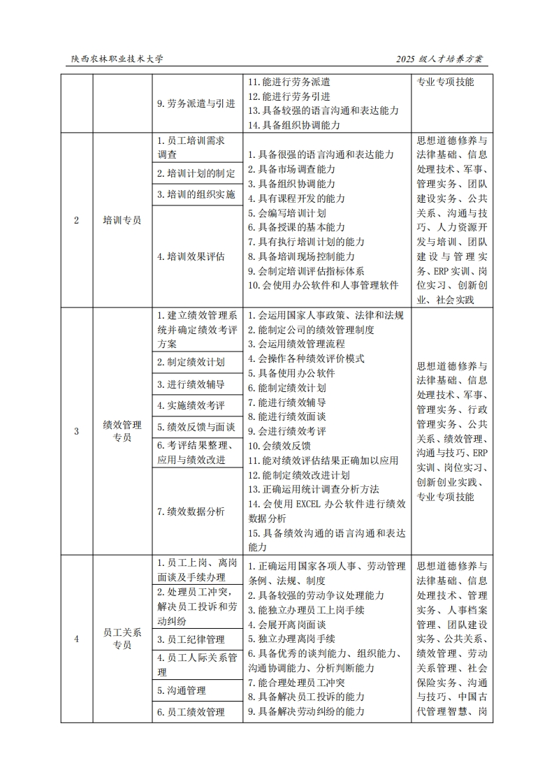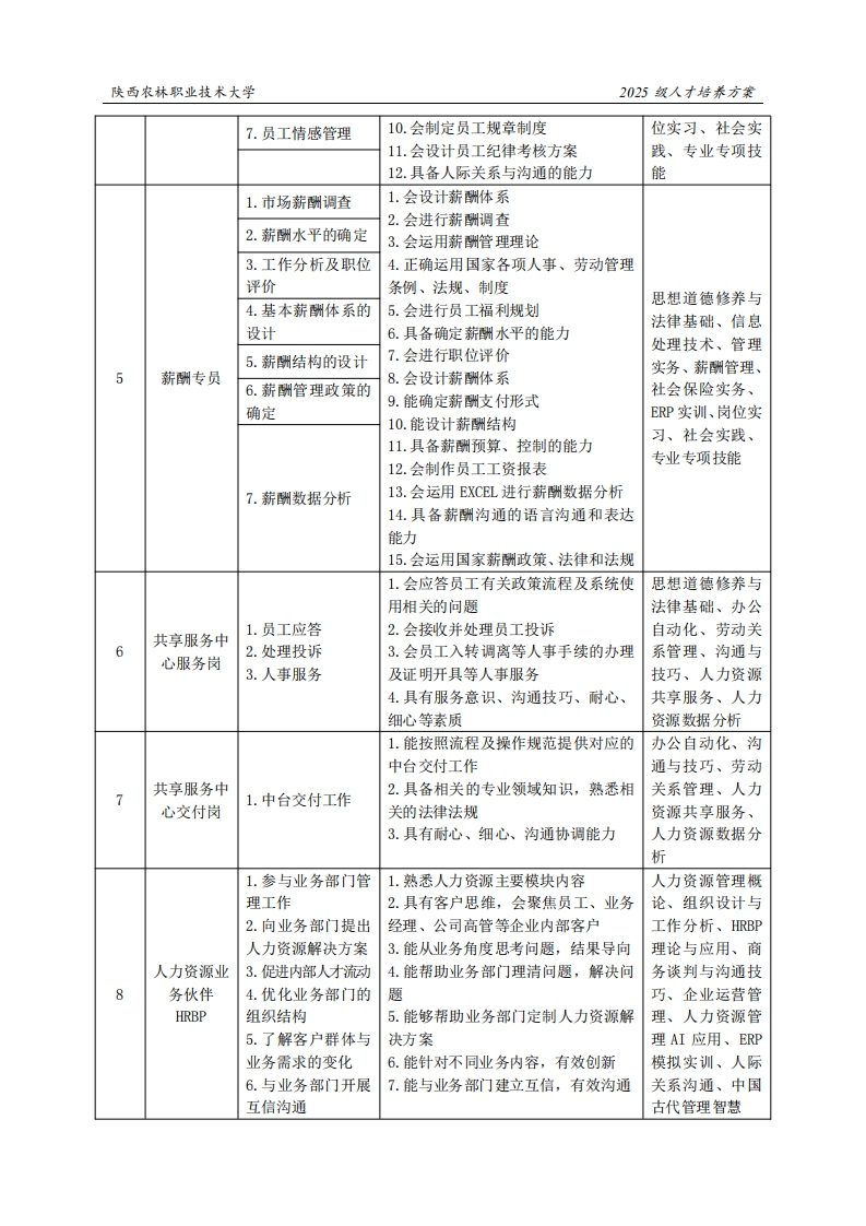 陕西农林职业技术大学2025级人才培养方案《人力资源管理》专业人才培养方案(普通三年制)一、专业名称(专业代码)人力资源管理(590202)二、入学基本要求招生对象:中等职业学校毕业、普通高级中学毕业或具备同等学力。招生类型:物理类、历史类兼收。三、基本修业年限三年。四、职业面向所属专业大类(代码)A公共管理与服务(59)所属专业类(代码)B公共事务管理(5902)对应行业(代码)C人力资源服务(726)主要职业类别(代码)D人力资源管理专业人员(2-06-08-01):人力资源服务专业人员(2-06-08-02)企事业单位内部人力资源部门内招聘专员、培主要岗位(群)或技术领域举例E训专员、社保专员、人事管理专员、员工关系专员、薪酬考核专员、人力共享服务中心岗位(HRSSC)、人力资源服务岗位群等:职业类证书举例F1+X证书:人力资源共享服务、人力资源数字化、人力资源数据分析五、职业岗位与职业能力分析序号工作岗位典型工作任务职业能力支撑课程1.工作分析1.会运用劳动法律法规和相关政策思想道德修养与2.人力资源规划2.会编写工作说明书法律基础、信息3.能够进行人力资源规划处理技术、军事、3.招聘计划的制定4.会制定招聘计划管理实务、基础4.人员招募5.会制定招聘相关表格会计、公共关系、招聘专员6.能从事人员招聘工作工作分析、人员5.人员甄选7.能从事人员甄选工作招聘与配置、ERP6.人员录用8.会运用人员录用流程及注意事项进实训、岗位实习、行人员录用职业生涯与发展7.招聘评估9.会进行招聘评估规划、就业指导、8.人力资源配置10.能合理配置人力资源创新创业实践、