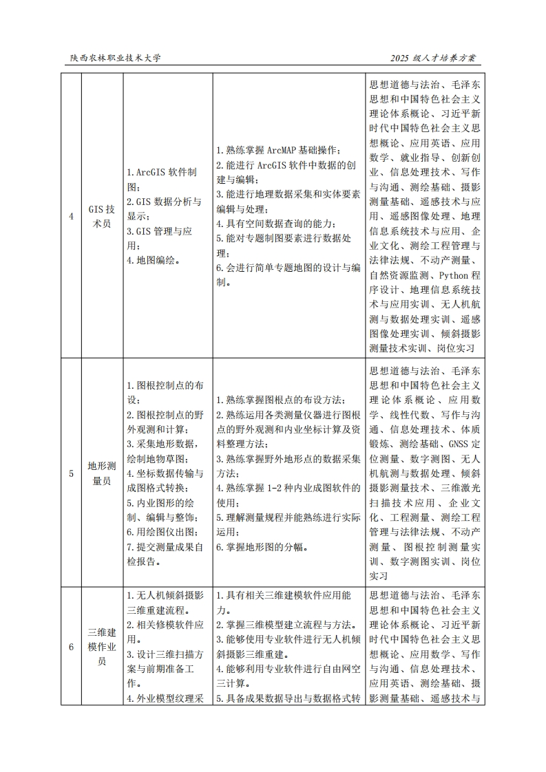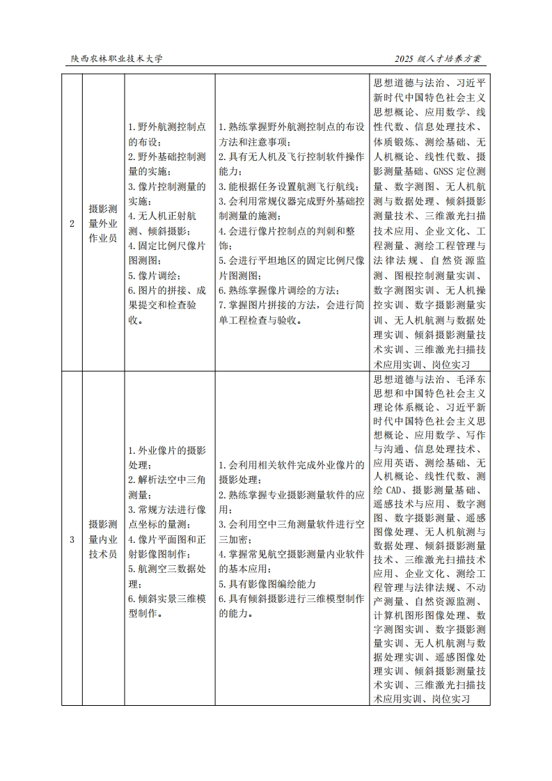 陕西农林职业技术大学2025级人才培养方案《无人机测绘技术》专业人才培养方案(普通三年制)一、专业名称(专业代码)无人机测绘技术(420307)二、入学基本要求招生对象:中等职业学校毕业、普通高级中学毕业或具备同等学力。招生类型:物理类、历史类兼收。三、基本修业年限三年。四、职业面向所属专业大类(代码)A资源环境与安全大类(42)所属专业类(代码)B测绘地理信息类(4203)对应行业(代码)C测绘地理信息服务(744)主要职业类别(代码)D测绘和地理信息工程技术人员(2-02-02)主要岗位(群)或技术领域举例E摄影测量、地图绘制、不动产测绘、无人机测绘操控、无人机驾驶、无人机装调检修职业类证书举例F无人机驾驶、无人机摄影测量、无人机操作应用五、职业岗位与职业能力分析序工作典型工作任务职业能力支撑课程号岗位1.熟悉常用款无人机的各项功能与思想道德与法治、毛泽东1.根据不同任务选技术参数:思想和中国特色社会主义择适配的无人机:2.能掌握航拍无人机的平稳操控:理论体系概论、习近平新2.无人机手控飞3.能够规划航拍路线、高效、安全时代中国特色社会主义思行:执行飞行任务:想概论、应用英语、写作无人机3.无人机影视航拍4.熟悉各种航拍技巧与拍摄手法:与沟通、测绘基础、无人驾驶员与后期制作:5.掌握基本的摄影摄像技术:机概论、信息处理技术、4.遥控器参数设置6.能够对影音图像素材进行后期处体质锻炼、无人机装调与与调试:理维护、无人机行业应用、5.无人机飞行前后7.能够在飞行前后对无人机及其他无人机航拍技术、计算机检查与维护。相关设备做监测、排故与维护。图形图像处理、无人机操8.具有一定的创新能力:控实训
