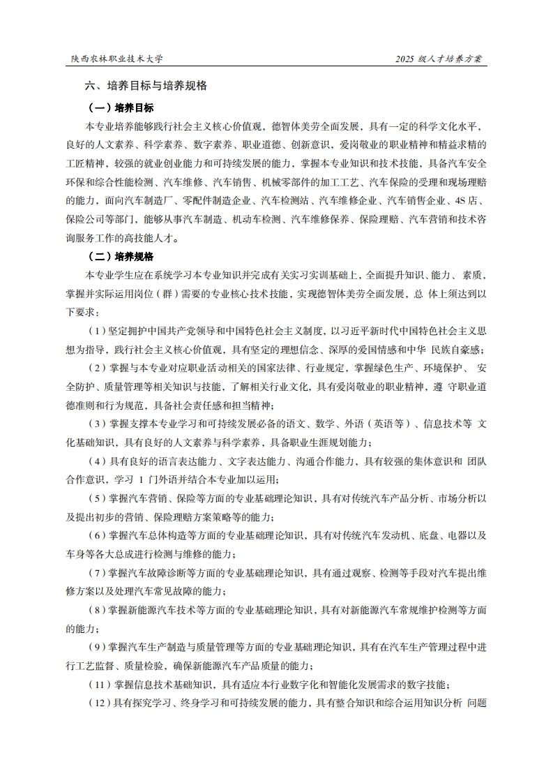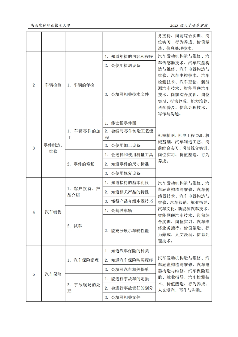 陕西农林职业技术大学2025级人才培养方案《汽车制造与试验技术》专业人才培养方案(普通三年制)一、专业名称(专业代码)汽车制造与试验技术(460701)二、入学基本要求招生对象:中等职业学校毕业、普通高级中学毕业或具备同等学力。招生类型:物理类、历史类兼收。三、基本修业年限三年。四、职业面向所属专业大类(代码)A装备制造(46)所属专业类(代码)B汽车制造(4607)对应行业(代码)C汽车制造业(36)汽车工程技术人员(2-02-07-11),汽车运用工程技术人员(2-02-15-01),汽车整车制造人员(6-22-02),主要职业类别(代码)D汽车零部件、饰件生产加工人员(6-22-01),检验试验人员(6-31-03),机动车检测工(4-08-05-05)汽车维修技术人员(4-12)成品装配、调试、测试、标定、质量检验及相关工艺管主要岗位(群)或技术领域举例E理和现场管理、车辆返修,汽车营运服务:售前售后技术支持汽车维修工职业类证书举例F汽车运用与维修职业技能等级证书五、职业岗位与职业能力分析序号工作岗位典型工作任务职业能力支撑课程1.车辆的日常维1.知道车辆日常保养项目护与保养汽车传感器技术、汽车发动2.会使用维修工具机构造与维修、汽车底盘构1.会使用故障诊断设备造与维修、汽车电器构造与汽车维修维修、汽车故障诊断技术、2.车辆的故障诊2.能分析故障的原因液压与气动技术、汽车空调、断与排除3.知道排除故障的方法新能源汽车技术、汽车检测技术、智能网联汽车技术、4.会填写维修工单汽车电控技术、汽车维修业