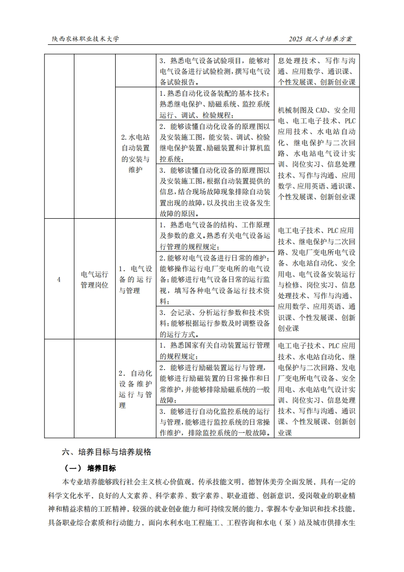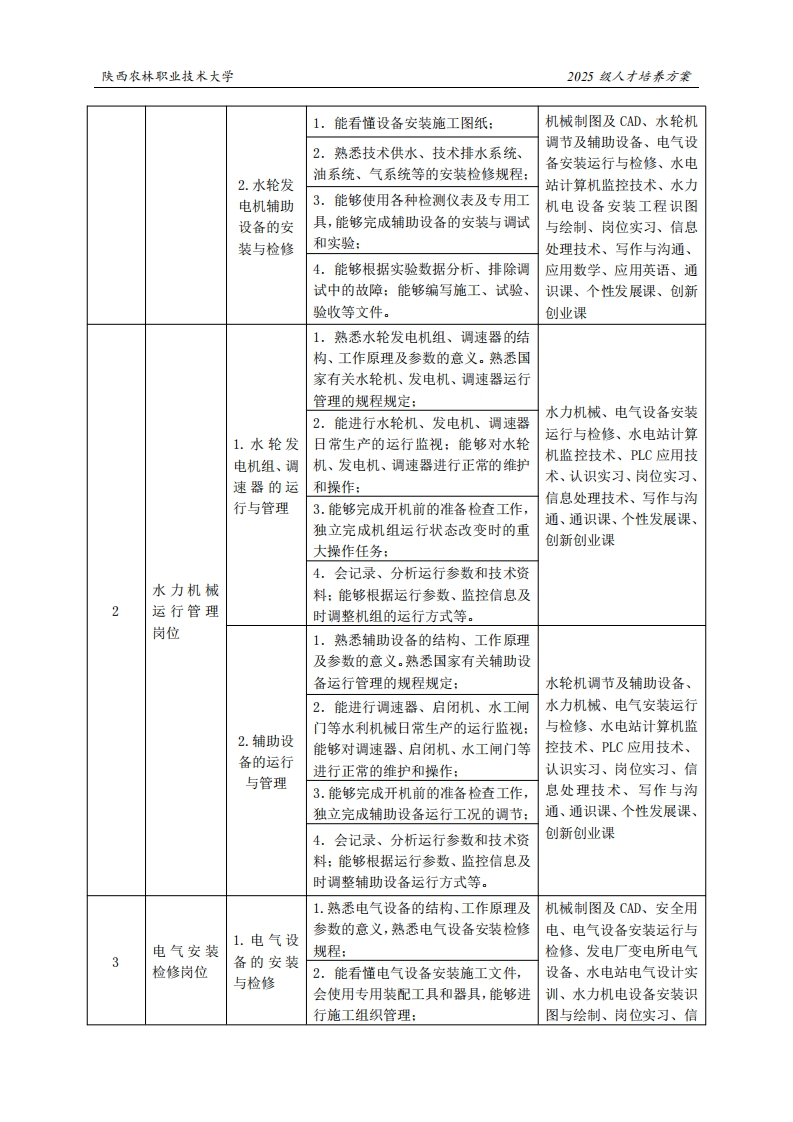 陕西农林职业技术大学2025级人才培养方案《水利机电设备智能管理》专业人才培养方案(普通三年制)一、专业名称(专业代码)水利机电设备智能管理(450303)二、入学基本要求招生对象:中等职业学校毕业、普通高级中学毕业或具备同等学力。招生类型:物理类。三、基本修业年限三年。四、职业面向所属专业大类(代码)A水利大类(45)所属专业类(代码)B水利水电设备类(5503)对应行业(代码)C其他水利管理业(7690)发电工程技术人员(2-02-12-01)、电工电器工程主要职业类别(代码)D技术人员(2-02-11-01)、设备工程技术人员(2-02-07-04)主要岗位(群)或技术领域举例E水轮发电机组及调速器的运行与管理、水轮发电机辅助设备的安装与检修、水电站自动装置的安装与维护1+X证书发电集控运维、1+X证书变配电运维、1+X职业类证书举例F证书继电保护检修五、职业岗位与职业能力分析典型工作序号工作岗位任务职业能力支撑课程1.熟悉水轮发电机组、调速器的结构、工作原理及参数的意义,熟悉水机械制图及CAD、水力机轮发电机组、调速器安装检修规程:械、水轮机调节及辅助设2.能读懂结构图和装配图、能够依备、电气设备安装运行与1.水轮发据装配图进行水轮发电机的安装:检修、水电站计算机监控水力机械电机组、调技术、水力机电设备安装安装检修3.能使用各种专用工具及仪表,能速器的安识图与绘制、认识实习、岗位够完成机组安装过程中的各种检测装与检修和试验:岗位实习、信息处理技术、写作与沟通、应用数4.会排除调试过程中出现的故障:学、应用英语、通识课、5.能够编制机组安装施工进度计划,个性发展课、创新创业课机组试运行计划。