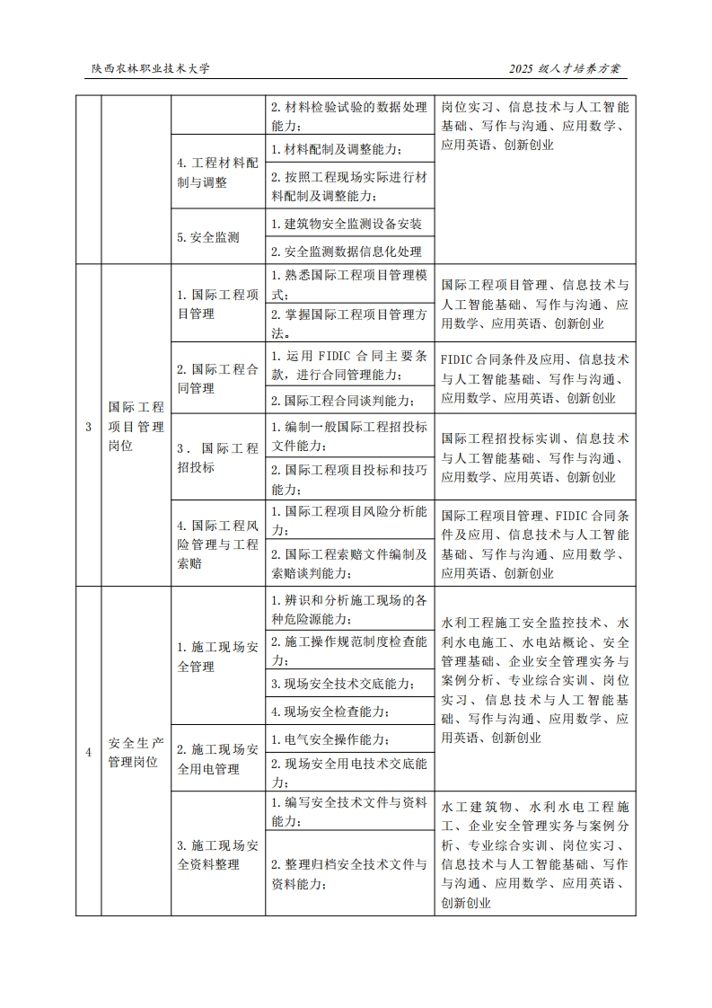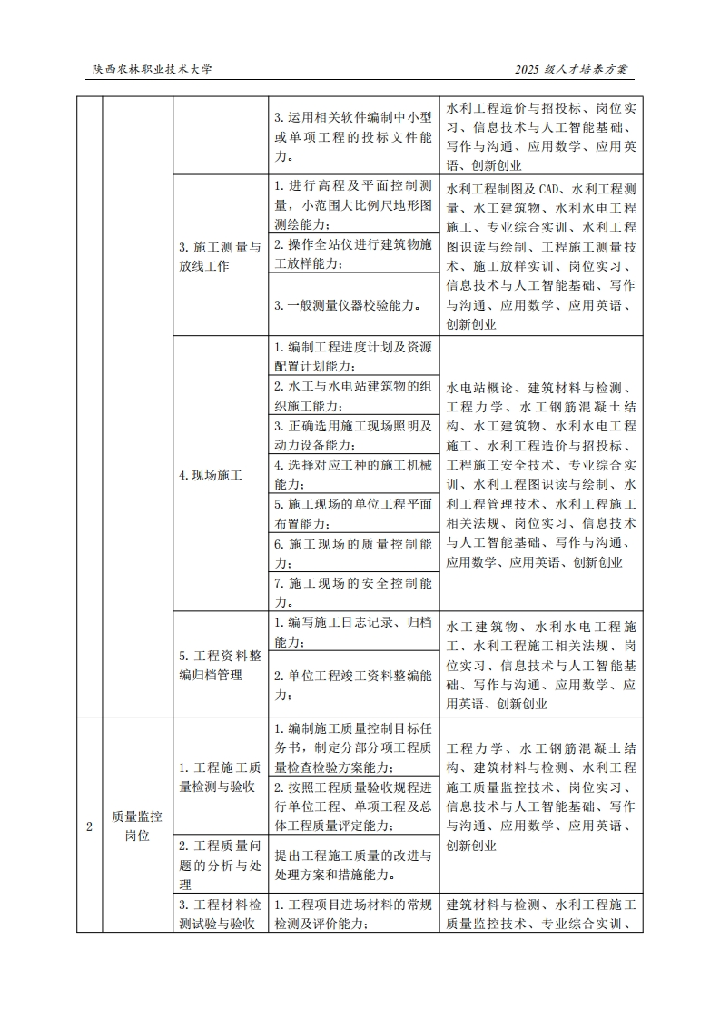 陕西农林职业技术大学2025级人才培养方案《水利水电建筑工程》专业人才培养方案(普通三年制)一、专业名称(专业代码)水利水电建筑工程(450205)二、入学基本要求招生对象:中等职业学校毕业、普通高级中学毕业或具备同等学力。招生类型:物理类三、基本修业年限三年。四、职业面向所属专业大类(代码)A水利大类(45)所属专业类(代码)B水利工程与管理类(4502)对应行业(代码)C水利工程建筑(482)水利管理业(762)主要职业类别(代码)D1.水利水电建筑工程技术人员(2-02-18-12)2.水利工程管理工程技术人员(2-02-21-03)1.水利水电工程(国际工程)施工现场管理2.水利水电工程施工现场质量监控主要岗位(群)或技术领域举例E3.水利水电工程施工现场安全管理4.中小型水利水电工程辅助设计5.水利工程运行管理土木工程混凝土材料检测职业类证书举例F建筑信息模型(BIM)大坝安全智能监测五、职业岗位与职业能力分析序号工作岗位典型工作任务职业能力支撑课程1.识读工程施工图纸并进行水利工程制图及CAD、水工建筑工程量计算能力:物、水利水电工程施工、水利工1.施工图识读程图识读与绘制、岗位实习、信与技术交底2.与设计方进行施工图的技息技术与人工智能基础、写作与施工技术沟通、应用数学、应用英语、创1术交流能力。管理岗位新创业2.施工技术方1.编制工程施工方案能力:水力分析与计算、工程地质与土案设计及投标2.设计各工种施工工艺及施工技术、工程水文计算、水工建文件编制工流程能力:筑物、水利水电工程施工、水利