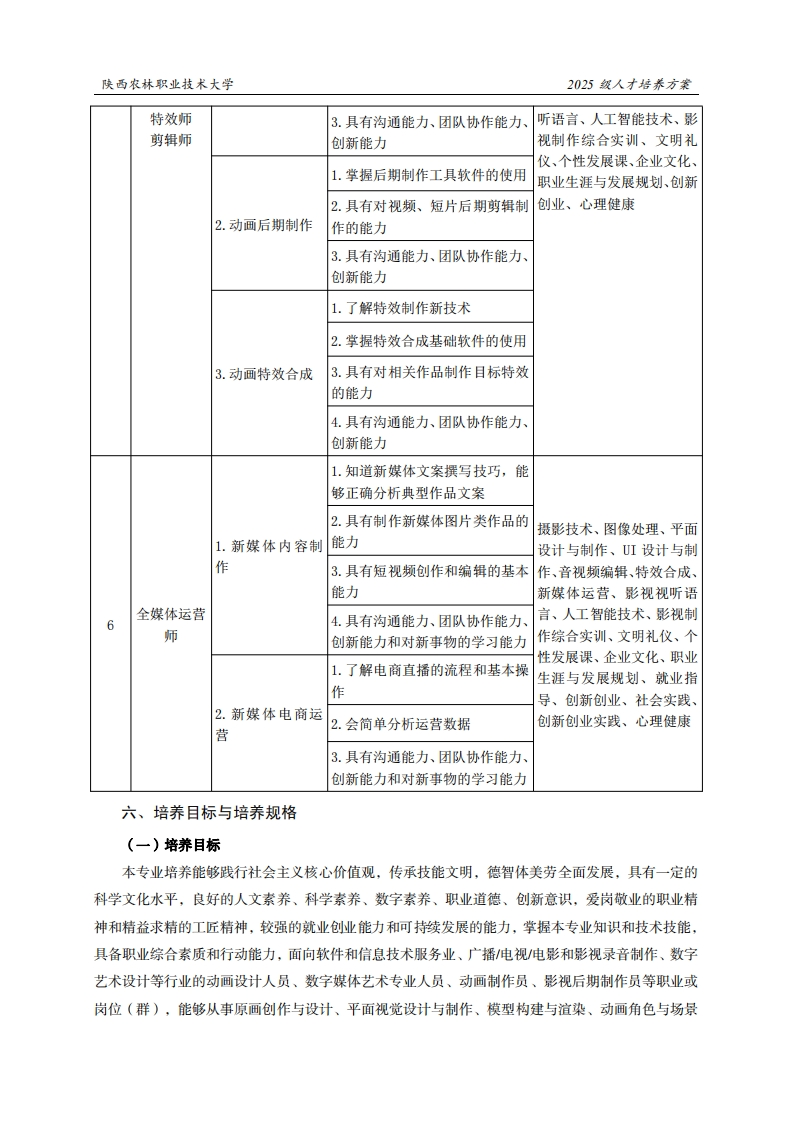 陕西农林职业技术大学2025级人才培养方案《动漫制作技术》专业人才培养方案(普通三年制)一、专业名称(专业代码)动漫制作技术(510215)二、入学基本要求招生对象:中等职业学校毕业、普通高级中学毕业或具备同等学力。招生类型:物理类、历史类兼收。三、基本修业年限三年。四、职业面向所属专业大类(代码)A电子与信息大类(51)所属专业类(代码)B计算机类(5102)对应行业(代码)C软件和信息技术服务业(65)广播、电视、电影和影视录音制作业(87)动画设计人员(2-0906-03)剪辑师(2-0903-06)主要职业类别(代码)D数字媒体艺术专业人员(2-0906-07)动画制作员(4-13-0202)原画创作平面设计制作主要岗位(群)或技术领域举例E模型设计动画设计制作非线性编辑动画设计师职业类证书举例F动画制作员1+X3D引擎技术应用职业资格等级证书五、职业岗位与职业能力分析序号工作岗位典型工作任务职业能力支撑课程1.能够熟练使用PS办公自动化相关软件,具有办公软件的基本信息处理技术、写作与沟办公自动化操作操作能力办公室文秘及日常办公文档通、应用数学、应用英语、2.具有办公文档编撰处理能力思想道德与法治、文明礼撰写3.具有沟通能力、团队协作能力、仪、个性发展课、心理健康创新能力