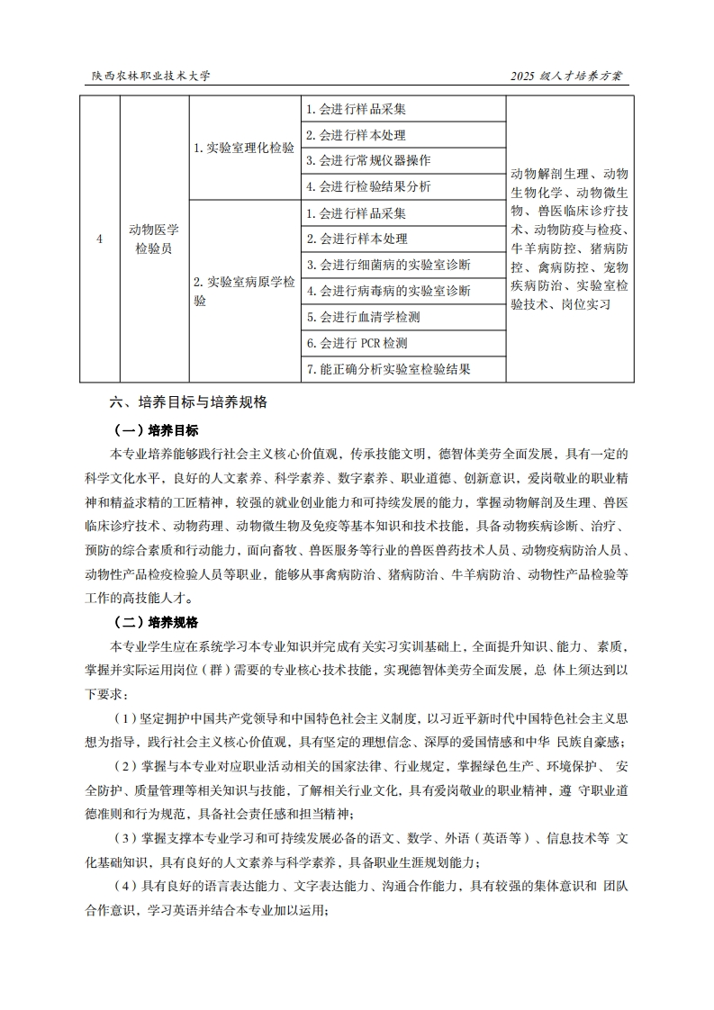 陕西农林职业技术大学2025级人才培养方案《动物医学》专业人才培养方案(普通三年制)一、专业名称(专业代码)动物医学(410301)二、入学基本要求招生对象:中等职业学校毕业、普通高级中学毕业或具备同等学力。招生类型:物理类、历史类兼收三、基本修业年限三年。四、职业面向所属专业大类(代码)农林牧渔(41)所属专业类(代码)畜牧业类(4103)对应行业(代码)畜牧业(03)、畜牧服务业(053)兽医(2-03-06-01)、动物疫病防治员主要职业类别(代码)(5-05-02-03)、动物检疫检验员(5-05-02-04)主要岗位(群)或技术领域举例执业兽医、生物安全员、兽医、技术服务动物疫病防治员、动物检疫检验员、执业兽医师职业类证书举例资格证书五、职业岗位与职业能力分析序号工作岗位典型工作任务职业能力支撑课程1.能正确保存和准备生物制品动物微生物、动物流2.会制定动物免疫程序行病学基础、兽医临3.能正确使用疫苗等生物制品床诊疗技术、畜牧兽医法规、智能养殖环1.动物疾病防控4.会正确消毒器械、场地等境控制技术、动物生5.动物疫病监测产技术、实验室检验养殖企业技术、动物防疫检疫兽医6.具有兽医执法能力技术、猪病防控、禽7.能合理安排和判断动物养殖生产病防控、牛羊病防控环节1.会进行动物疾病临床检查兽医临床诊疗技术、实验室检测技术、畜2.动物疾病诊断2.会进行动物疾病实验室诊断禽繁育、猪病防控、3.会进行动物疾病病理学诊断禽病防控、牛羊病防