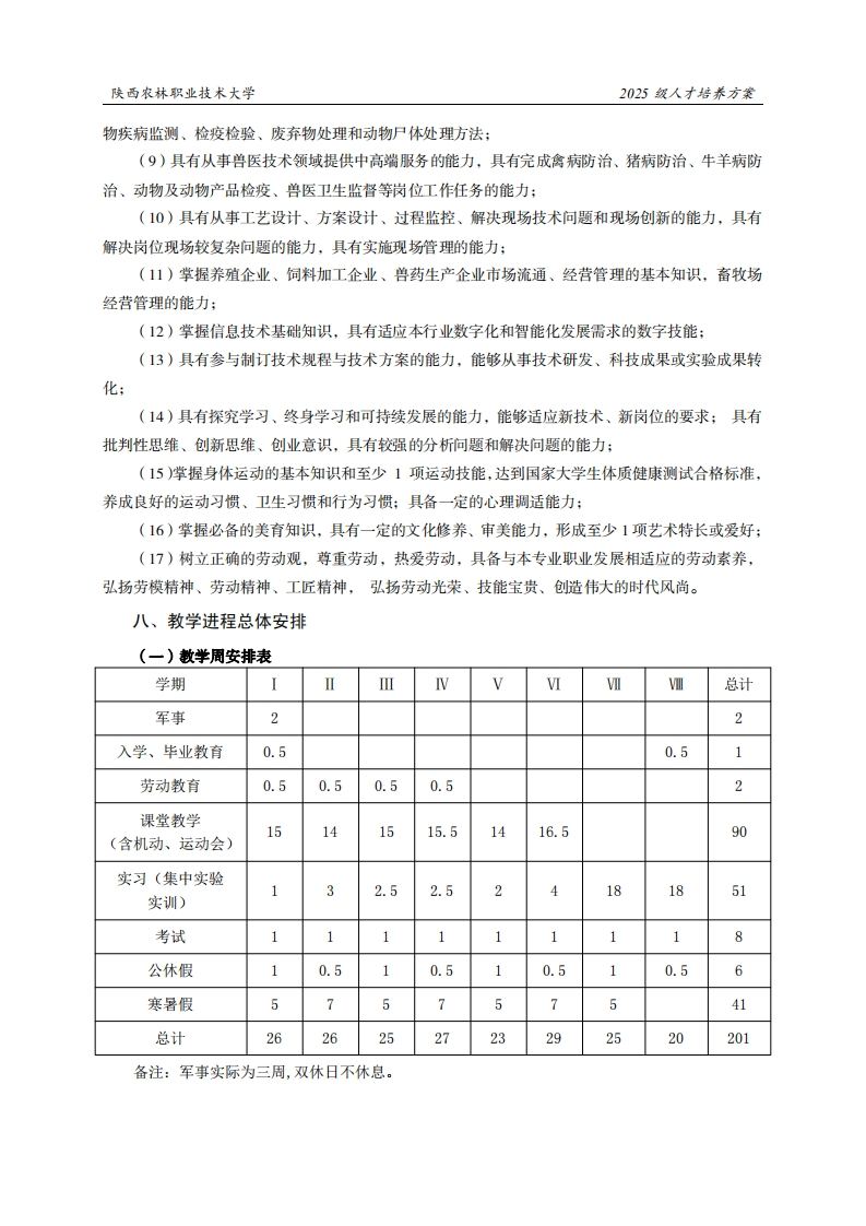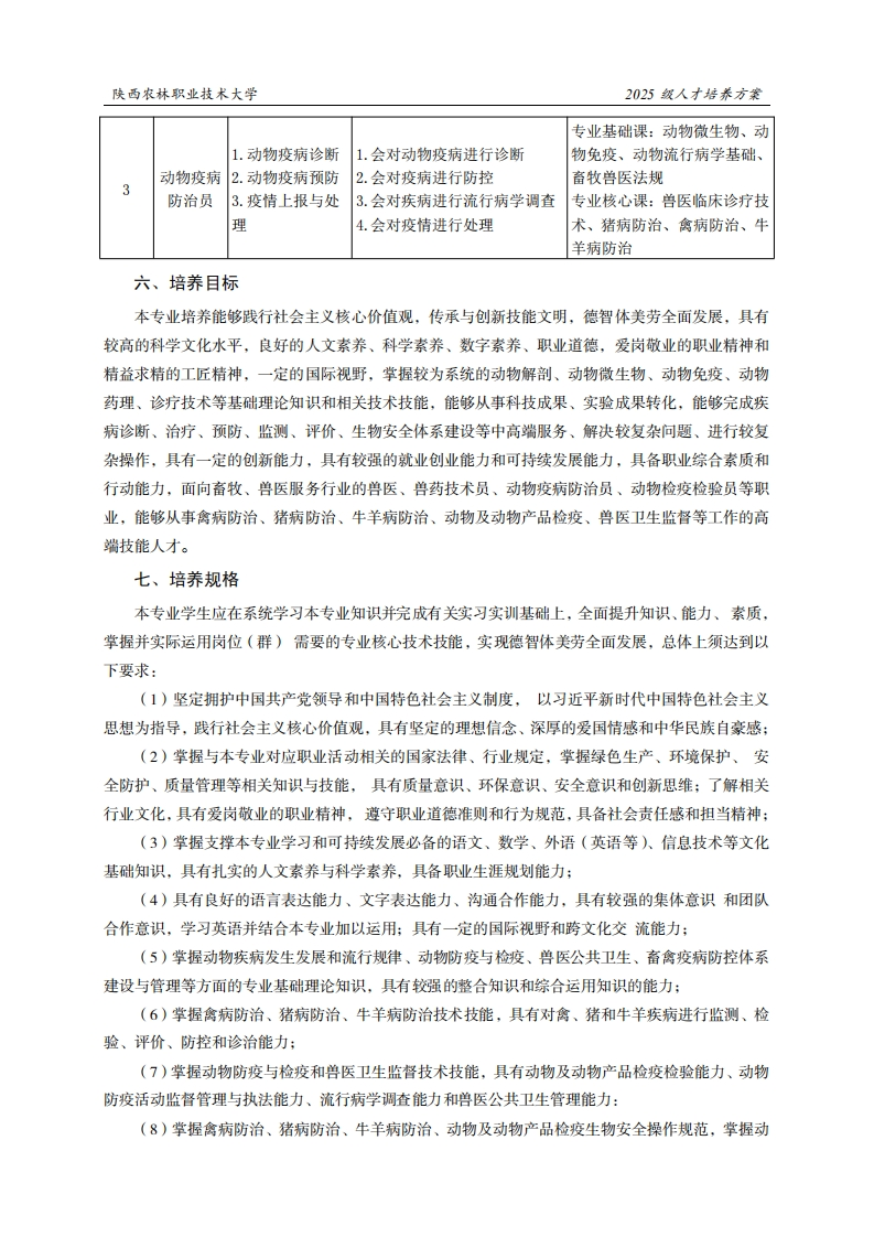 陕西农林职业技术大学2025级人才培养方案《动物医学》专业人才培养方案一、专业名称(专业代码)专业名称:动物医学专业代码:210301二、入学基本要求招生对象:中等职业学校毕业、普通高级中学毕业或具备同等学力。招生类型:物理类三、修业基本年限四年四、职业面向所属专业大类(代码)农林牧渔(41)所属专业类(代码)畜牧业类(4103)对应行业(代码)畜牧业(03)、兽医服务(7493)兽医(2-03-06-01)、动物疫病防治员(5-05-02-03)、主要职业类别(代码)动物检疫检验员(5-05-02-04)禽病防治、猪病防治、牛羊病防治、兽医、饲料或兽药主要岗位(群)或技术领域技术服务、动物疫病检验检疫、兽医卫生监督执业兽医师资格证书、动物检疫检验员、动物疫病防治职业类证书员、1+X家庭农场畜禽养殖五、职业岗位与职业能力分析序号工作岗位典型工作任务职业能力支撑课程1.会对动物疾病进行临床诊断专业基础课:2.会对动物疾病进行特殊诊断动物解剖与组织胚胎、动物生1.动物疾病诊断3.会对疾病进行实验室诊断理、专业核心课:兽医2.动物疾病治疗4.会对疾病进行流行病学调查兽医临床诊疗技术、猪病防3.动物疾病预防5.会对疾病进行治疗治、禽病防治、牛羊病防治、6.会制订免疫程序中兽医诊疗专业基础课:动物微生物、动1.会对动物疾病进行临床诊断1.动物疫病监测物免疫、动物病理、动物流行2.会对疾病进行实验室诊断动物检疫2.动物检疫检验病学基础2检验员3.动物卫生监督3.会对动物产品进行检疫专业核心课:动物防疫检疫、4.会对疾病进行流行病学调查执法动物性食品卫生监督5.会对疫情进行处理