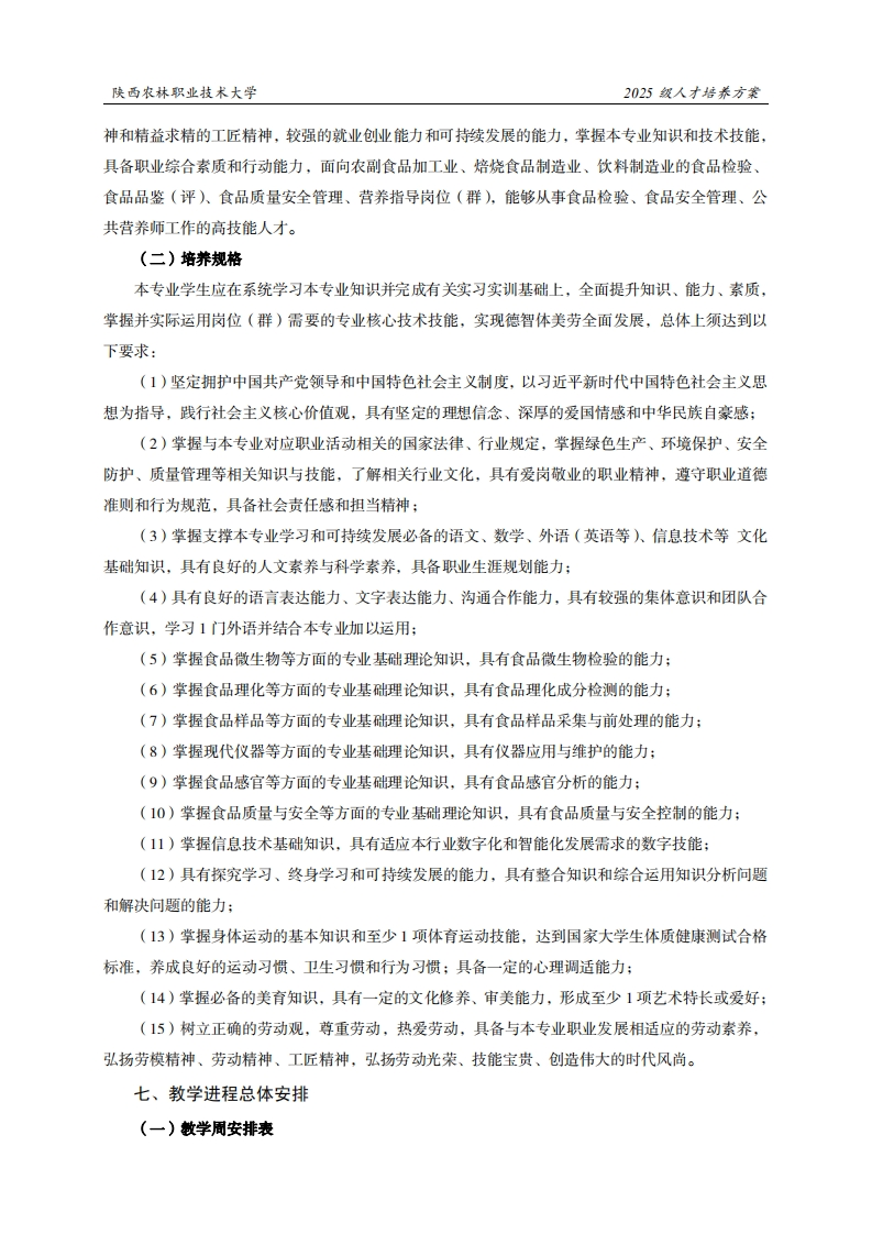 陕西农林职业技术大学2025级人才培养方案《食品检验检测技术》专业人才培养方案(普通三年制)一、专业名称(专业代码)食品检验检测技术(490104)二、入学基本要求招生对象:中等职业学校毕业、普通高级中学毕业或具备同等学力。招生类型:物理类。三、基本修业年限三年。四、职业面向所属专业大类(代码)A食品药品与粮食大类(49)所属专业类(代码)B食品类(4901)对应行业(代码)C农副食品加工业(13):焙烧食品制造(14):饮料制造(15)主要职业类别(代码)D专业技术人员(20000):社会生产服务和生活服务人员(40000):生产制造及有关人员(60000)20224食品工程技术人员:20231检验检疫工程技术人员:4030206营养配餐员:4030211食品安全管理师:4080501主要岗位(群)或技术领域举例E农产品食品检验员:6020402乳品评鉴师:6020507调味品品评师:6020607品酒师:6020611评茶员可食食品快速检验技能等级证书:食品合规管理技能等级职业类证书举例F证书:食品检验管理技能等级证书五、职业岗位与职业能力分析序号工作岗位典型工作任务职业能力支撑课程1.食品各项指标分析操作能力。食品微生物检验技术、2.计算机初级应用能力。食品理化检验技术、现1.食品检验工作3.一般人际沟通能力。代仪器分析技术、信息4.一定文字撰写能力。处理技术、中文写作与5.实验室安全控制能力。沟通食品检验1.粮油各项指标分析操作能力。食品微生物检验技术、岗位2.粮油质量检2.计算机初级应用能力。食品理化检验技术、现代仪器分析技术、信息验工作3.一般人际沟通能力。4.一定文字撰写能力。处理技术、中文写作与5.实验室安全控制能力。沟通3.畜禽产品检1.畜产品各项指标分析操作能力。食品微生物检验技术、