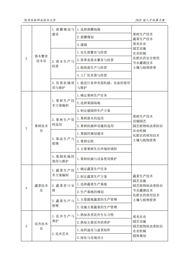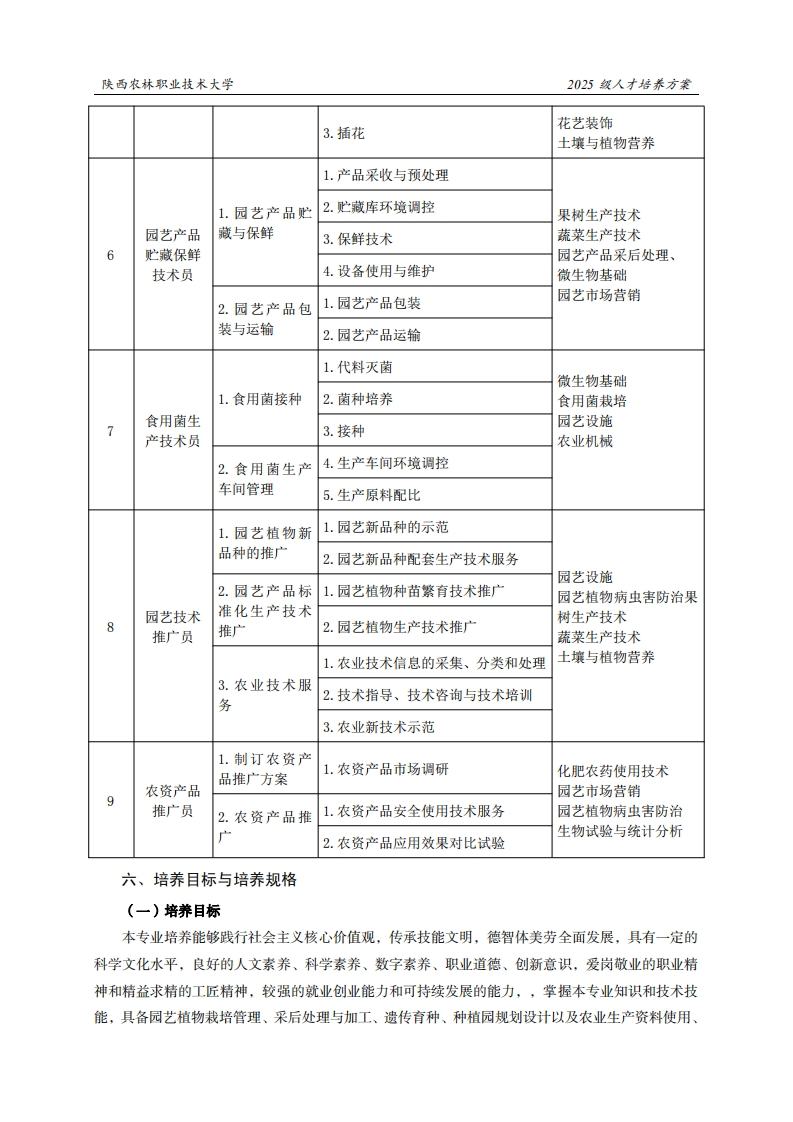 陕西农林职业技术大学2025级人才培养方案《园艺技术》专业人才培养方案(普通三年制)一、专业名称(专业代码)园艺技术(410105)二、入学基本要求招生对象:中等职业学校毕业、普通高级中学毕业或具备同等学力。招生类型:物理类、历史类兼收。三、基本修业年限三年。四、职业面向所属专业大类(代码)A农林牧渔大类(41)所属专业类(代码)B农业类(4101)蔬菜、食用菌及园艺植物种植(014)对应行业(代码)C水果种植(015)农业专业及辅助性活动(051)园艺技术人员(2-03-04)、园艺工(5-01-02-02)、主要职业类别(代码)D农业生产服务人员(5-05-01)、植物保护人员(5-05-02)果树、蔬菜、花卉生产,园艺种子种苗繁育,园主要岗位(群)或技术领域举例E艺产品采后处理、园艺技术推广职业类证书举例F设施蔬菜生产、植保无人飞机应用五、职业岗位与职业能力分析序号工作岗位典型工作任务职业能力支撑课程1.园艺植物种子生产1.种子生产管2.各级种子的繁育果树生产技术理蔬菜生产技术2.新品种推广3.种子管理观光农业种子生产技术员4.熟知品种特征特性生物试验与统计园艺设施1.清楚新品种配套栽培技术土壤与植物营养2.种子生产管园艺植物育种技术理2.组培苗生产与经营3.工厂化育苗与经营