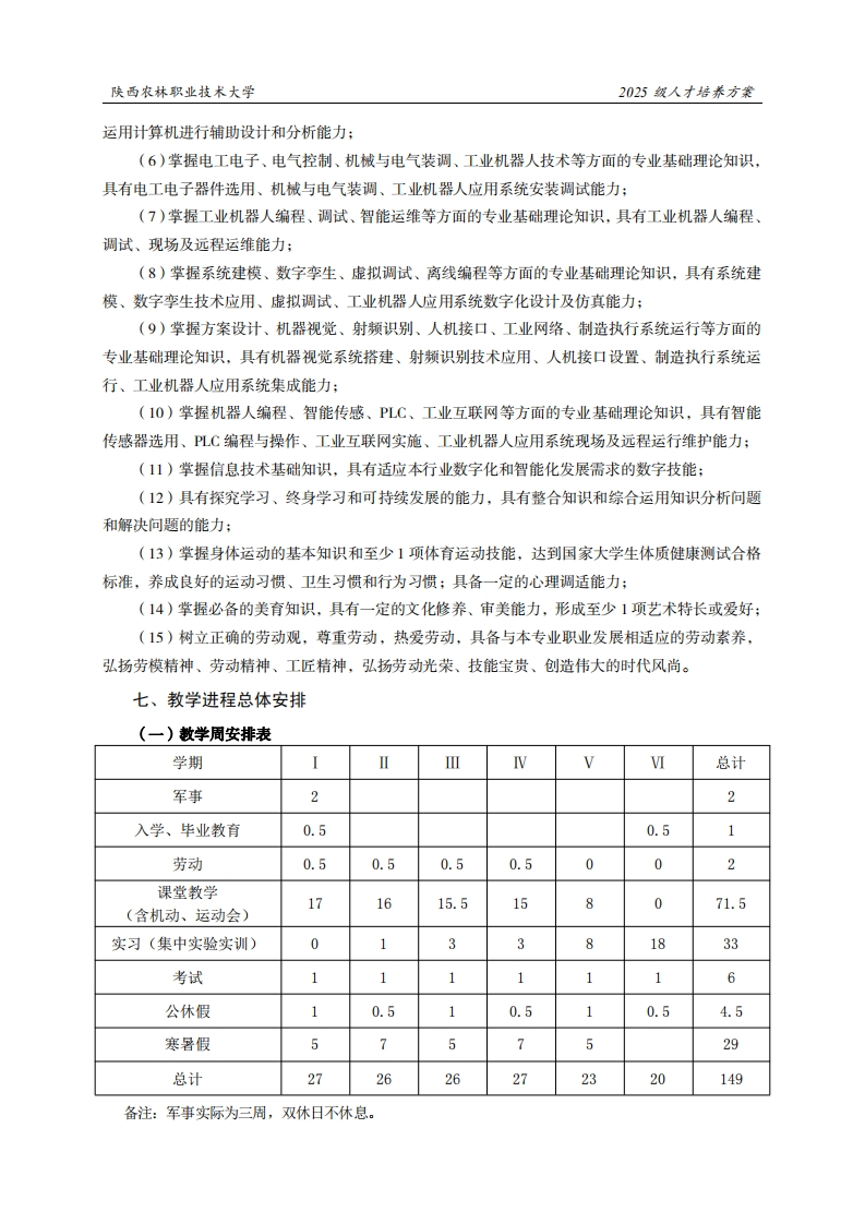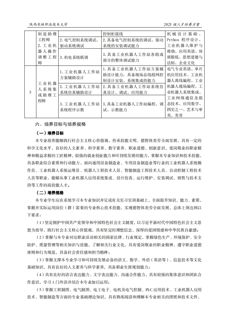 陕西农林职业技术大学2025级人才培养方案《工业机器人技术》专业人才培养方案(普通三年制)一、专业名称(专业代码)工业机器人技术(460305)二、入学基本要求招生对象:中等职业学校毕业、普通高级中学毕业或具备同等学力。招生类型:物理类、历史类兼收。三、基本修业年限三年。四、职业面向所属专业大类(代码)A装备制造大类(46)所属专业类(代码)B自动化类(4603)对应行业(代码)C通用设备制造业(34)、专用设备制造业(35)工业机器人系统操作员S(6-31-07-03)、工业机器人系统运维员S(6-31-07-01)、机器人工程技术人员S主要职业类别(代码)D(2-02-38-10)、智能制造工程技术人员S(2-02-38-05)、自动控制工程技术人员S(2-02-07-07)工业机器人应用系统集成,工业机器人应用系统运行维主要岗位(群)或技术领域举例E护,自动化控制系统安装调试、销售与技术支持工业机器人应用编程、工业机器人操作与运维、智能制职业类证书举例F造生产管理与控制五、职业岗位与职业能力分析序号工作岗位典型工作任务职业能力支撑课程1.工业机器人电气系1.具备电气图的识图及绘图能力电工电子技术、电机与电气控制、PLC应1.工业机统安装调试器人电气2.具备低压电器的选型配套能力用技术、机械制图、设计助理2.工业机器人编程调计算机辅助设计工程师试3.具有机械部件的拆装能力(Auto CAD)、安全用电、工业机器人技2.工业机4.具备工业机器人的编程设计调术基础、信息处理技器人装调3.工业机器人工作站试能力术与维修工程总控系统编程、调试师5.具备工业机器人工作站电气控人工智能技术、写作(PLC、人机界面、总与沟通、心理健康、线通信)制系统设计安装及故障排除能力耕读教育类课程1.工业机1.电气控制柜安装接1.具备电气控制基础知识,掌握电传感器与检测技术、器人电气线气控制系统接线方法,能独立完成自动化生产线技术、
