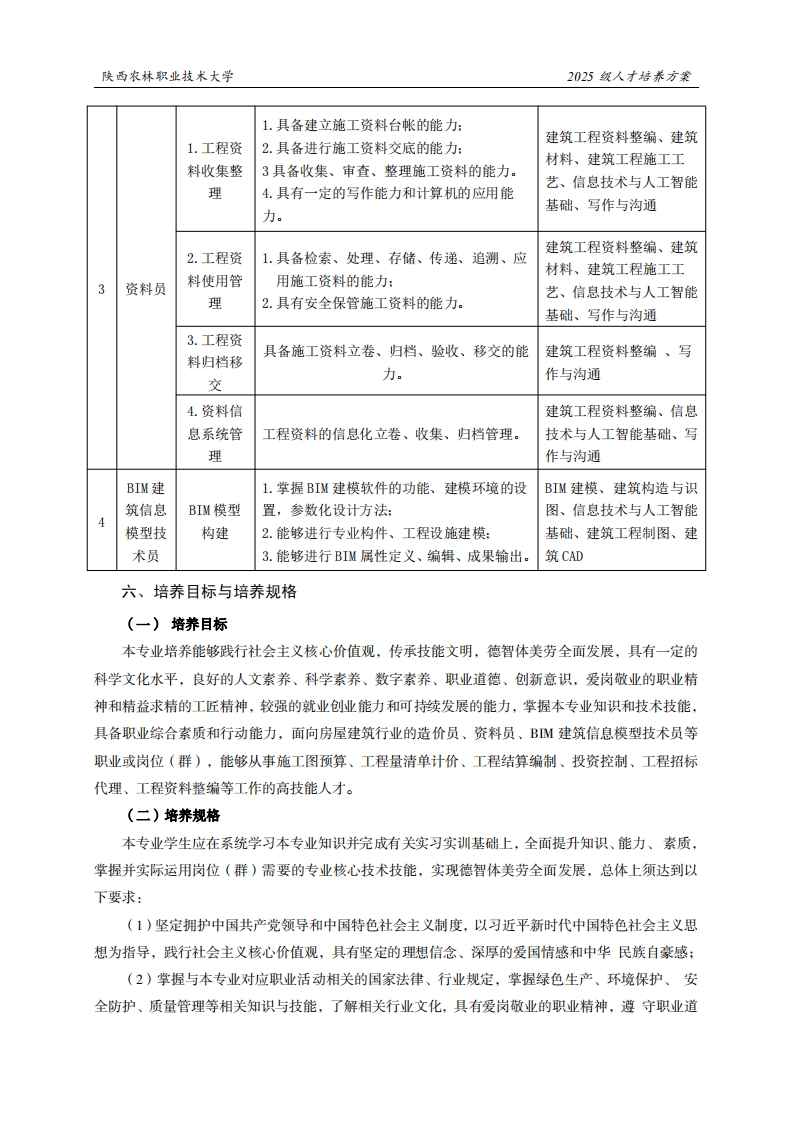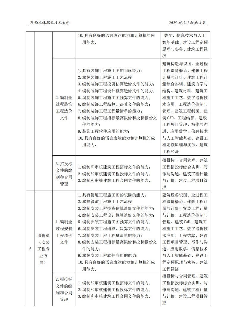 陕西农林职业技术大学2025级人才培养方案《工程造价》专业人才培养方案(普通三年制)一、专业名称(专业代码)工程造价(440501)二、入学基本要求招生对象:中等职业学校毕业、普通高级中学毕业或具备同等学力。招生类型:物理类、历史类兼收。三、基本修业年限三年。四、职业面向所属专业大类(代码)A土木建筑大类(44)所属专业类(代码)B建设工程管理类(4405)对应行业(代码)C专业技术服务业(74)主要职业类别(代码)D管理(工业)工程技术人员(2-02-30)造价员主要岗位(群)或技术领域举例E资料员BIM建筑信息模型技术员二级造价工程师(土木建筑工程)职业类证书举例F二级造价工程师(安装工程)“1+X”BIM建筑信息模型职业技能等级证书五、职业岗位与职业能力分析序工作典型工作职业能力支撑课程号岗位任务1.建筑构造与识图、建筑制图与CAD绘制能建筑构造与识图、全过程力:工程造价概论、建筑工程2.掌握建筑工程施工技术、施工工艺流程:计量与计价、建筑工程计造价员3.编制建筑工程投资估算造价文件的能力:量综合实训、建筑力学与1.编制全(土木4.编制建筑工程设计概算造价文件的能力:结构、建筑材料、建筑工过程建筑1建筑工5.编制建筑工程施工图预算文件的能力:程施工工艺、数字造价技工程造价程专业6.编制建筑工程结算、决算文件的能力:术应用、钢筋工程计量、文件方向)7.编制建筑工程工程量清单的能力:工程造价控制与管理、建8.编制建筑工程招标最高限价和投标报价文筑工程制图、建筑CAD、件的能力:工程结算、建设工程项目9.建筑工程软件应用的能力:管理、写作与沟通、应用
