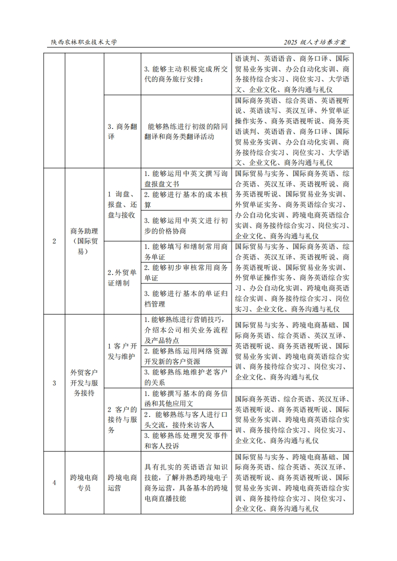 陕西农林职业技术大学2025级人才培养方案《应用英语》专业人才培养方案(普通三年制)一、专业名称(专业代码)应用英语(570202)二、入学基本要求招生对象:中等职业学校毕业、普通高级中学毕业或具备同等学力。招生类型:物理类、历史类兼收。三、基本修业年限三年。四、职业面向所属专业大类(代码)A教育(57)所属专业类(代码)B应用英语(570202)对应行业(代码)C商务服务业(72)主要职业类别(代码)D商务专业人员(2-06-07)主要岗位(群)或技术领域举例E国际商务实用英语交际职业技能等级证书(VETS)、剑桥商务英语职业类证书举例F证书(BEC)、英文导游资格证、跨境电商操作专员证书五、职业岗位与职业能力分析序号工作岗位典型工作任务职业能力支撑课程1.能够撰写商务来往的各种商务信函与应用文:国际商务英语、综合英语、英语视听说、英语读写、英汉互译、外贸单证2.能够熟练运用各种办公1.商务文自动化设备和软件:操作实务、商务英语视听说、商务英语谈判、英语语音、商务口译、国际商务行政件处理3.能够条理清晰地进行档贸易业务实训、办公自动化实训、商助理案管理:务接待综合实习、岗位实习、大学语4.能够运用沟通技巧完成文、企业文化、商务沟通与礼仪商务文件相关的各项任务:2.会议及1.能够熟练进行会议的安国际商务英语、综合英语、英语视听商务旅行排与记录:说、英语读写、英汉互译、外贸单证安排2.能够熟练安排商务旅行:操作实务、商务英语视听说、商务英