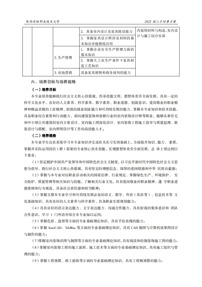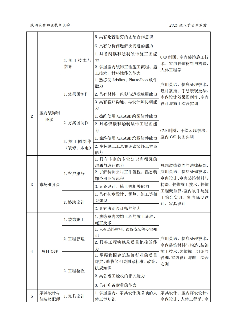 陕西农林职业技术大学2025级人才培养方案《建筑室内设计》专业人才培养方案(普通三年制)一、专业名称(专业代码)建筑室内设计(440106)二、入学基本要求招生对象:中等职业学校毕业、普通高级中学毕业或具备同等学力。招生类型:物理类、历史类兼收。三、基本修业年限三年。四、职业面向所属专业大类(代码)A土木建筑大类(44)所属专业类(代码)B建筑设计类(4401)对应行业(代码)C建筑装饰和装修(501)主要职业类别(代码)D室内装饰设计师(4-08-08-07)室内方案设计、室内施工图深化设计、家具设主要岗位(群)或技术领域举例E计与软装搭配、室内照明设计、室内绿化与内庭设计…职业类证书举例F室内设计、建筑装饰装修数字化设计…五、职业岗位与职业能力分析序工作岗位号典型工作任务职业能力支撑课程1.具有较强的沟通交际能力思想道德修养与法律基础、应用英语、信息处理技术、1.业务接待与室内设计、室内装饰材料与交流2.具有完备的专业知识结构和宣构造、设计概论、室内陈设传能力设计、室内设计与施工综合室内装饰设实训计师1.具有生活方式设计能力设计构成、室内陈设设计、2.具有艺术效果设计能力室内设计、人体工程学、手2.方案设计与表现3.具有整体项目和部分项目设计绘表现技法、CAD制图、室能力内设计效果图制作、家具设计4.具有手绘表现能力
