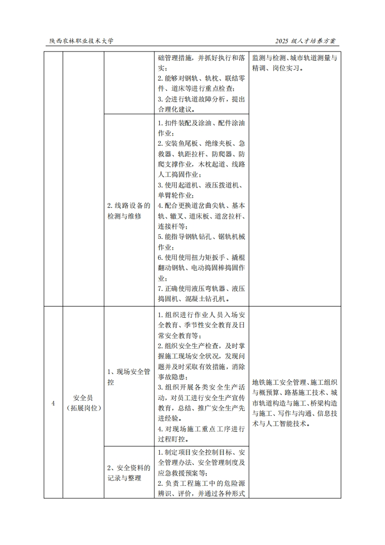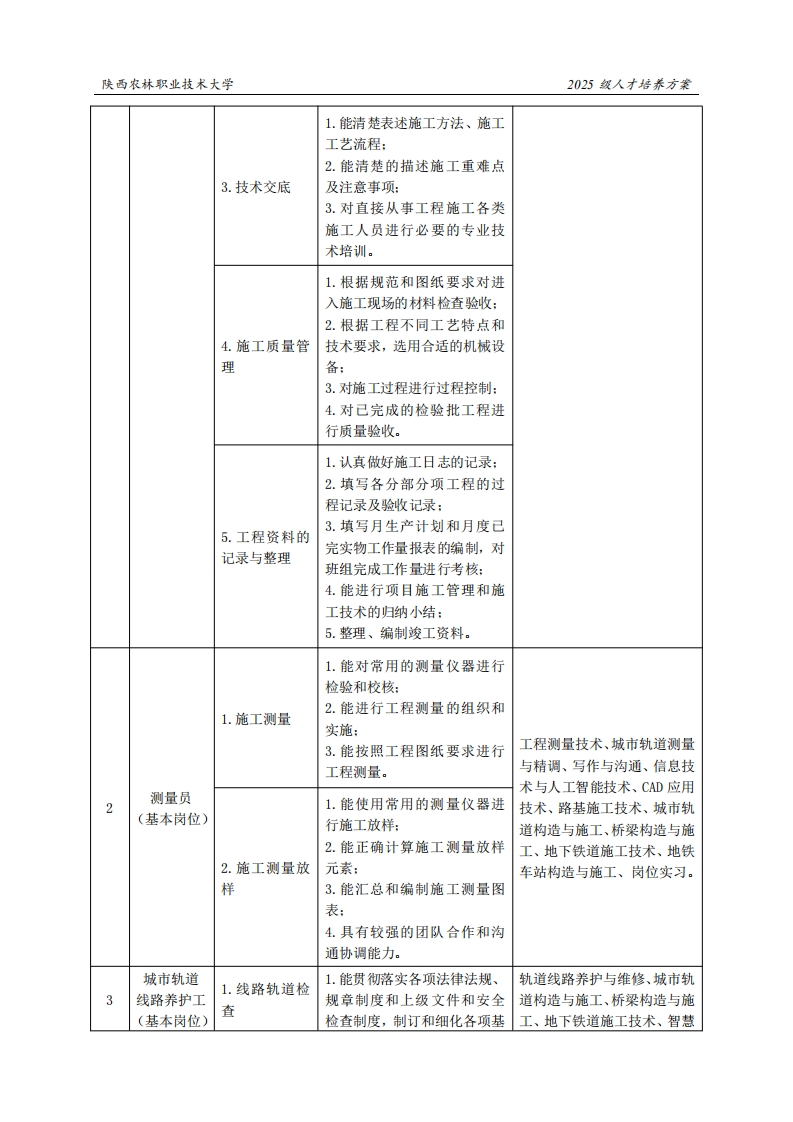 陕西农林职业技术大学2025级人才培养方案《城市轨道交通工程技术》专业人才培养方案(普通三年制)一、专业名称(专业代码)城市轨道交通工程技术500601)二、入学基本要求招生对象:中等职业学校毕业、普通高级中学毕业或具备同等学力。招生类型:物理类、历史类兼收。三、基本修业年限三年。四、职业面向所属专业大类(代码)A交通运输大类(50)所属专业类(代码)B城市轨道交通类(5006)城市轨道交通工程建筑(4814)对应行业(代码)C城市轨道交通(5412)铁路建筑工程技术人员(2-02-18-11)铁道工务工程技术人员(2-02-17-06)主要职业类别(代码)D铁路综合维修工(6-29-02-16)城市轨道交通检修工(6-29-02-17)主要岗位(群)或技术领域举例E轨道工程施工、工程检测、基础设施养护、工程项目管理城市轨道交通线路维护、土木工程混凝土材料检测、职业类证书举例F建筑工程质量检测、建筑信息模型五、职业岗位与职业能力分析序号工作岗位典型工作任务职业能力支撑课程1.能阅读图纸:写作与沟通、信息技术与人工2.汇总图纸疑问和存在的问智能技术、工程力学、结构设1.图纸会审题,发询问单:计原理、建筑材料、工程制图、3.如施工中发现图纸存在问CAD应用技术、路基施工技施工员题或需变更,提出变更申请。术、城市轨道构造与施工、桥(基本岗位)1.根据工程特点,充分了解施梁构造与施工、地下铁道施工工现场及周围环境,选择经济技术、施工组织与概预算、工2.编制施工方实用、科学合理的施工方案:程招投标与合同管理、智慧监案2.针对重点工程项目,编制专测与检测、地铁车站构造与施项施工方案。工、岗位实习。