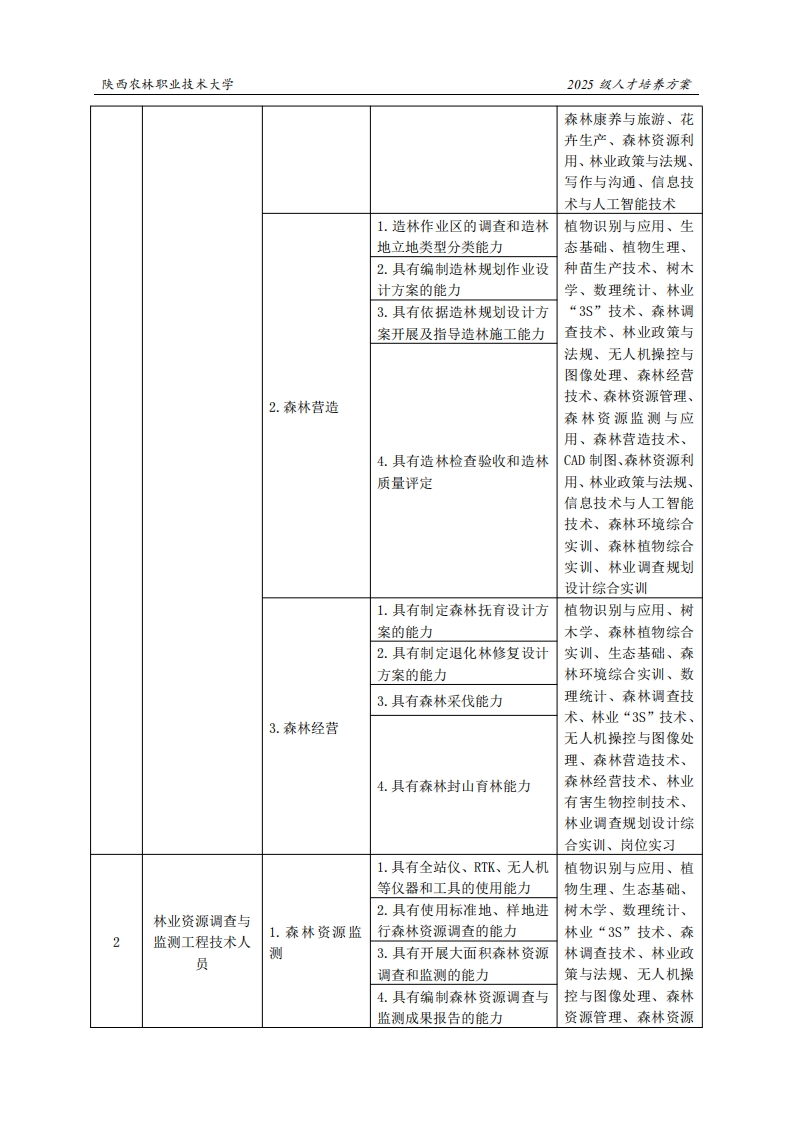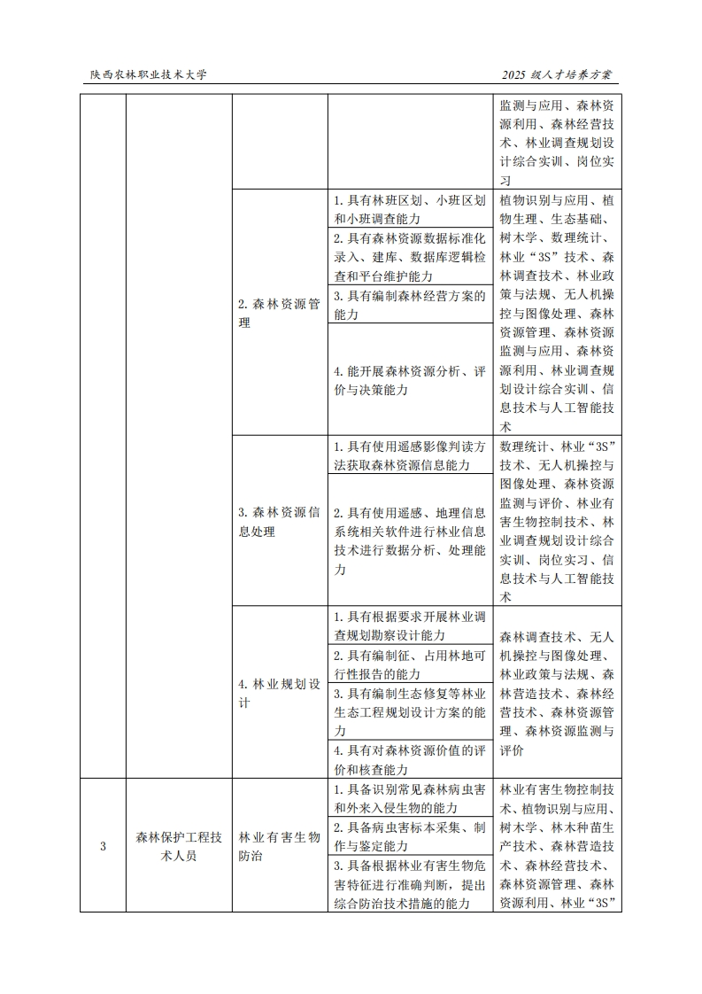 陕西农林职业技术大学2025级人才培养方案《林业技术》专业人才培养方案(普通三年制)一、专业名称(专业代码)林业技术专业(410201)二、入学基本要求招生对象:中等职业学校毕业、普通高级中学毕业或具备同等学力。招生类型:物理类、历史类兼收。三、基本修业年限三年。四、职业面向所属专业大类(代码)A农林牧渔大类(41)所属专业类(代码)B林业类(4102)对应行业(代码)C林业(A02)林业资源调查与监测工程技术人员(2-02-20-10)主要职业类别(代码)D森林培育工程技术人员(2-02-20-02)森林保护工程技术人员(2-02-20-06)林木种苗生产、造林工程、森林经营、森林资源主要岗位(群)或技术领域举例E调查与监测、森林资源管理、林业有害生物防治、林业规划设计、森林碳汇有害生物防治员职业资格证、森林消防员职业资职业类证书举例F格证、无人机操作应用职业技能1+X证书、造林更新工五、职业岗位与职业能力分析序号工作岗位典型工作任务职业能力支撑课程1.具有良种引种、选育能力植物识别与应用、植2.具有种实调制和种子质量物生理、树木学、林检验能力木种苗生产技术、森林营造技术、森林经3.具有苗圃地选择、苗圃规营技术、森林资源管森林培育工程技划设计和施工的能力1.种苗生产理、林业“3S”技术、术人员4.具有苗木繁育及苗圃地经CAD制图、数理统计、营管理的能力林业政策与法规、无5.具有苗木出圃及种苗销售人机操控与图像处的能力理、林业有害生物控制技术、经济林栽培、