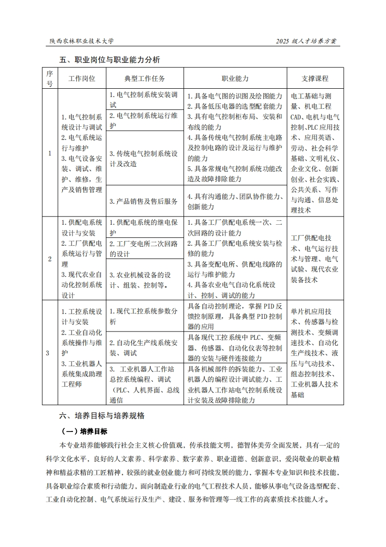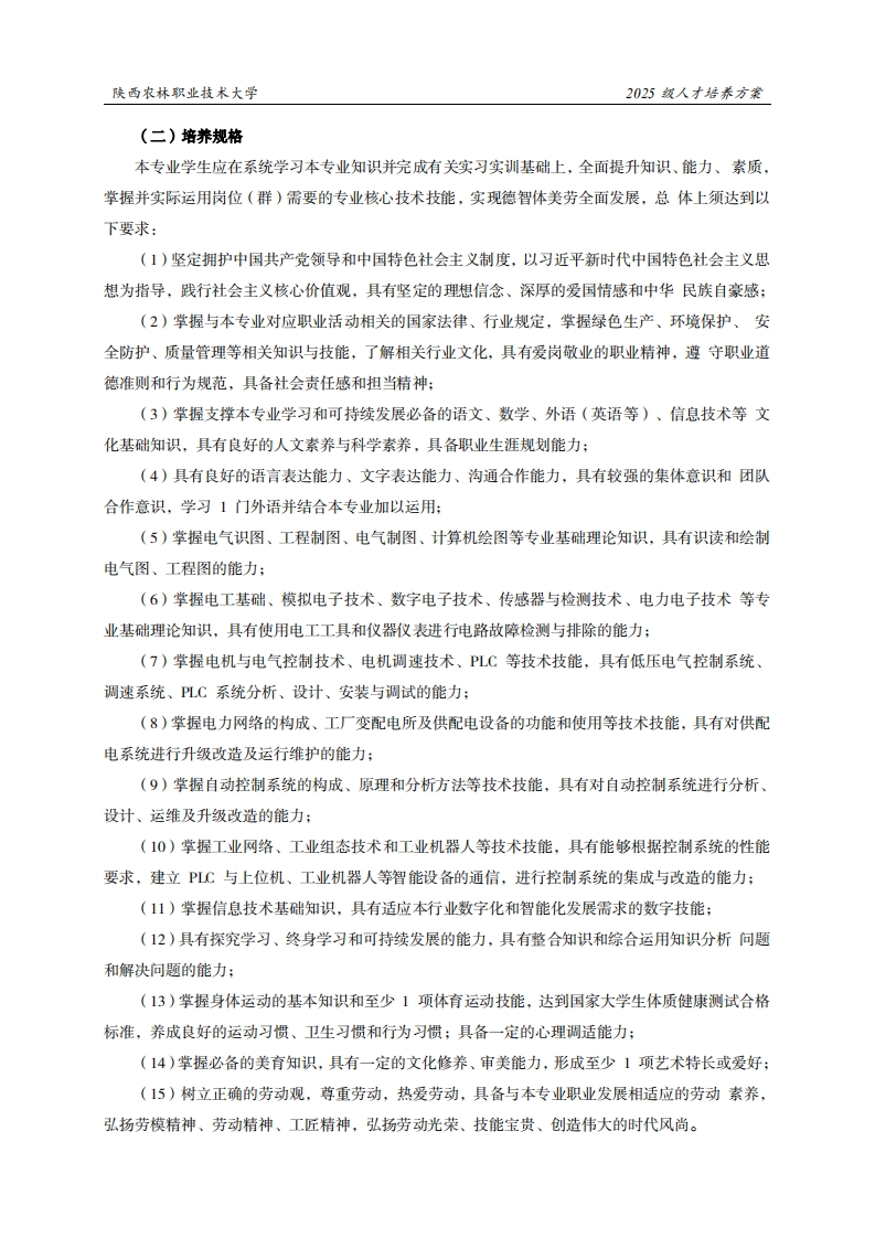 陕西农林职业技术大学2025级人才培养方案《电气自动化技术》专业人才培养方案(普通三年制)一、专业名称(专业代码)电气自动化技术(460306)二、入学基本要求招生对象:中等职业学校毕业、普通高级中学毕业或具备同等学力。招生类型:物理类、历史类兼收。三、基本修业年限三年。四、职业面向所属专业大类(代码)A46装备制造大类所属专业类(代码)B4603自动化类C1100制造业C3499通用设备制造业对应行业(代码)CC3592专用设备制造业C3799电气机械及器材制造业2-02-11电气工程技术人员2-02-07-07自动控制工程技术人员主要职业类别(代码)D6-24-01电机制造人员6-24-02输配电及控制设备制造人员2-03-09农业工程技术人员主要从事电机与电器、电力拖动与自动控制系统及装置等研究、开发、设计、制造、试验、供用电工程技术等岗位主要岗位(群)或技术领域举例E如电气工程师、自动化设备维护工程师、可编程序控制系统设计师(员)、维修电工、电气值班员等运动控制系统开发与应用职业技能等级、可编职业类证书举例F程控制系统集成及应用职业技能等级证书、工业机器人应用编程职业技能等级证书