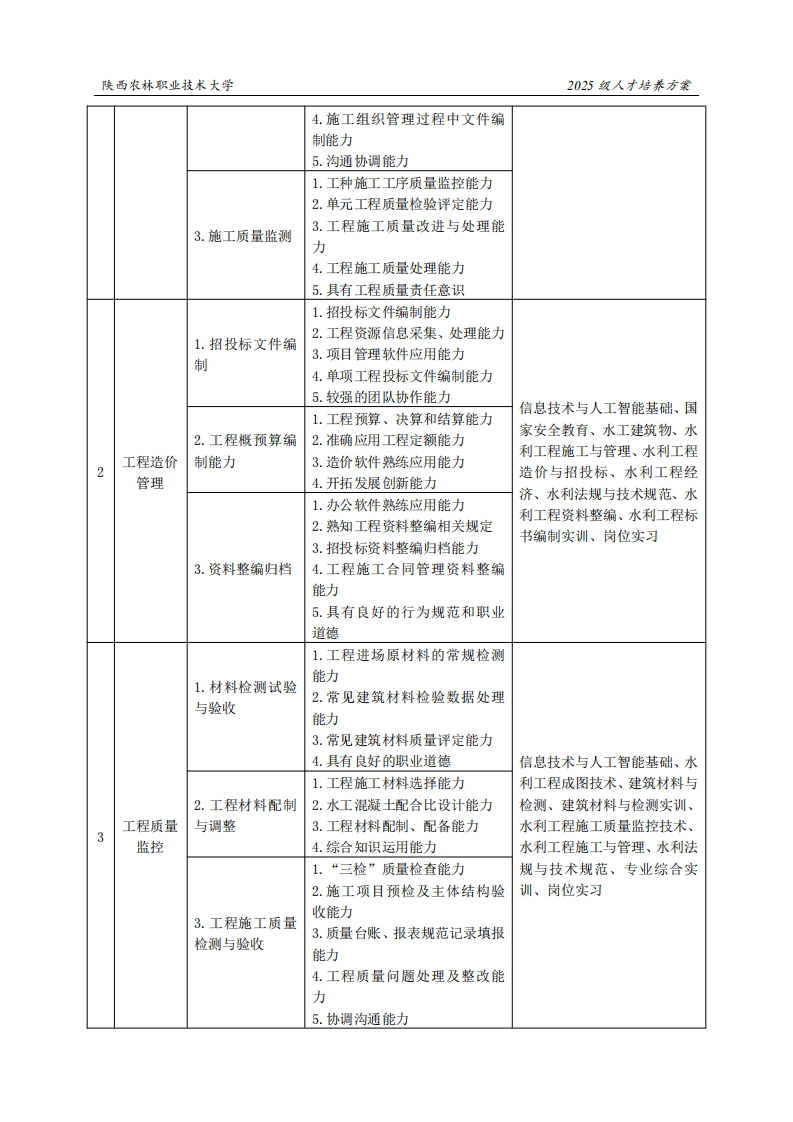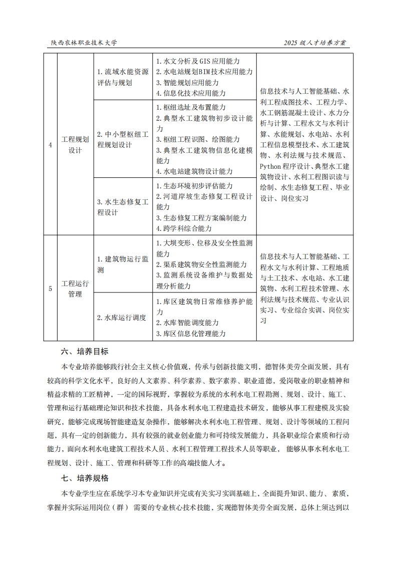 陕西农林职业技术大学2025级人才培养方案《水利水电工程》专业人才培养方案一、专业名称(专业代码)水利水电工程(250203)二、入学基本要求招生对象:中等职业学校毕业、普通高级中学毕业或具备同等学力。招生类型:物理类三、修业基本年限四年四、职业面向所属专业大类(代码)水利大类(25)所属专业类(代码)水利工程与管理类(2502)对应行业(代码)水利工程建筑(482)、水利管理业(76)水利水电建筑工程技术人员(2-02-18-12)、水利工程管理主要职业类别(代码)工程技术人员(2-02-21-03)水利水电工程(国际工程)施工技术管理、水利水电工程造主要岗位(群)或技术领域价管理、水利水电工程质量监控、中小型水利水电工程设计、水利工程运行管理建造师(水利水电工程)、注册建筑师、造价工程师、注册职业类证书土木工程师、水利工程质量检测员资格、监理工程师五、职业岗位与职业能力分析序工作岗位典型工作任务职业能力支撑课程号1.常见工种施工能力2.施工放线能力信息技术与人工智能基础、水3.施工图纸的识图与绘制能力利工程成图技术、水利工程测4.施工方案设计能力绘技术、水利工程信息模型技1.工程施工技术5.各工种智能建造流程设计能术、水工建筑物、水电站、水力利工程施工与管理、国际工程施工技术6.与人合作能力项目管理、水利工程智能装备管理7.精益求精的工匠创新能力与施工、水利工程施工质量监1.单项工程的施工组织设计能控技术、水利法规与技术规力范、水利工程安全智能监控、2.现场施工组织及管理2.现场工程进度及资源配置规专业综合实训、岗位实习划能力3.施工现场组织、管理能力
