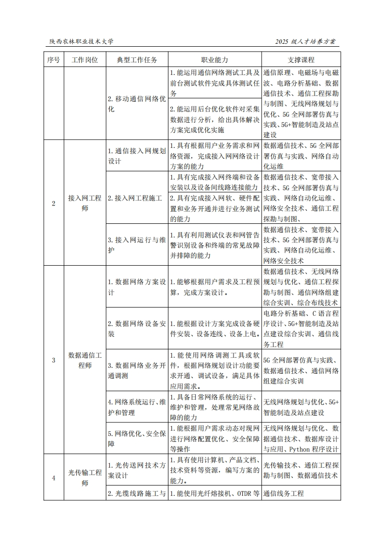 陕西农林职业技术大学2025级人才培养方案《现代通信工程》专业人才培养方案一、专业名称(专业代码)现代通信工程(310301)二、入学基本要求招生对象:中等职业学校毕业、普通高级中学毕业或具备同等学力。招生类型:物理类三、修业基本年限四年四、职业面向所属专业大类(代码)电子与信息大类(31)所属专业类(代码)通信类(3103)电信、广播电视和卫星传输服务(63),软件和信息技术服务业(65),数字经济新兴技术(《数字经济及其核心产业统计分类对应行业(代码)(2021)》)中的数字技术应用业(03)、数字要素驱动业(04)、数字化效率提升业(05)等。通信工程技术人员(2-02-10-01)、信息通信网络机务员主要职业类别(4-04-0201)、信息通信网络运行管理员(4-04-04-01)、数字(代码)化解决方案设计师(4-04-04-05)。信息通信工程勘察、设计、监理与施工等岗位,信息通信网络运行维护与优化等岗位,信息化系统使用、维护和管理等岗位,信主要岗位(群)或技术领域息通信领域云计算应用和服务岗位,信息通信行业应用方案设计、营销岗位。《5G移动网络运维》“1+X”职业技能等级认证证书、《5G基站建设与维护》“1+X”职业技能等级认证证书、《5G移动通信网络职业类证书部署与运维》“1+X”职业技能等级认证证书、华为HCIA、HCP认证.五、职业岗位与职业能力分析序号工作岗位典型工作任务职业能力支撑课程1.能使用指南针、GPS、相机、通信原理、电磁场与电磁计算机、地图、卷尺等工具完波、电路分析基础、数据成通信网络工程勘察通信技术、通信工程探勘网规网优工1.移动通信网络规程师划与制图、无线网络规划与2.能运用通信仿真软件进行规优化、5G全网部署仿真与划仿真预测,完成通信网络的实践、5G+智能制造及站点建设方案建设