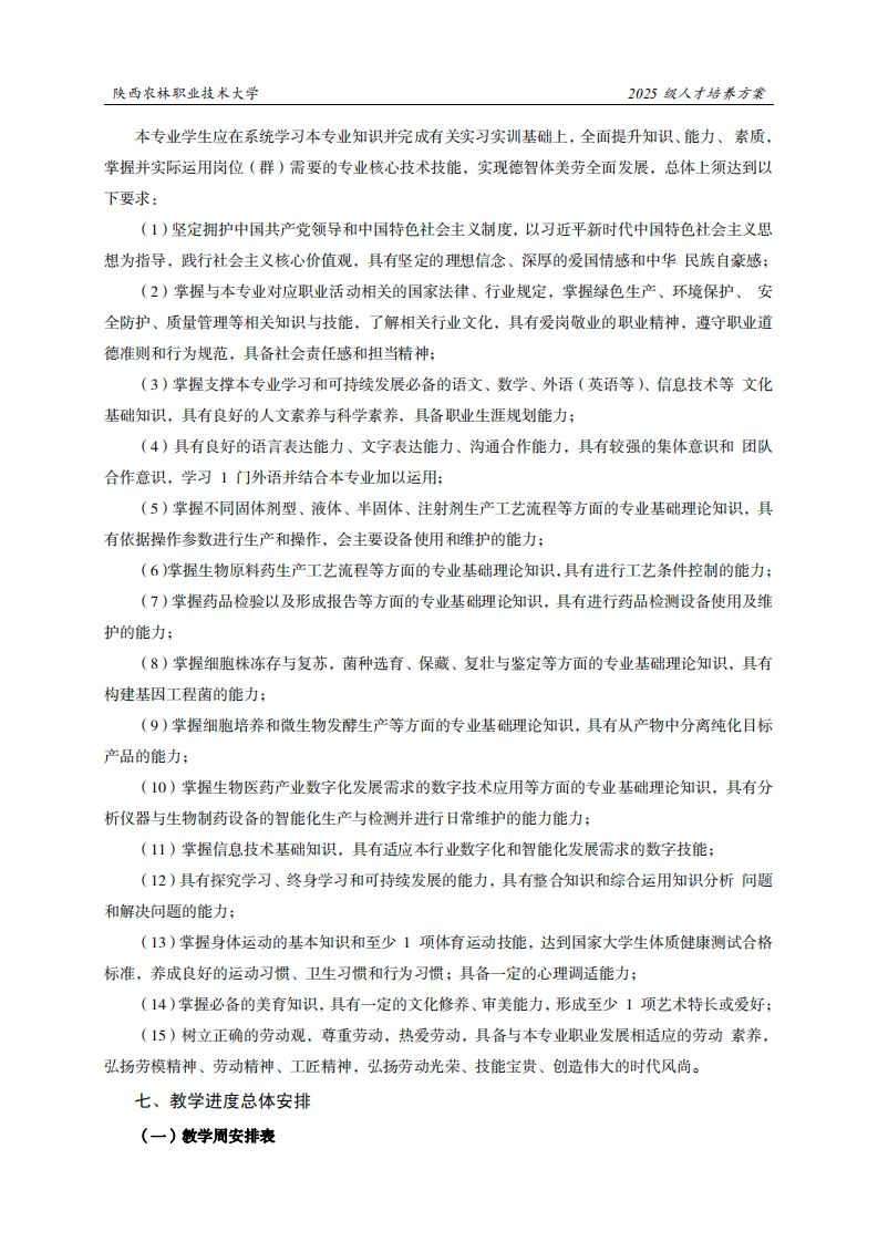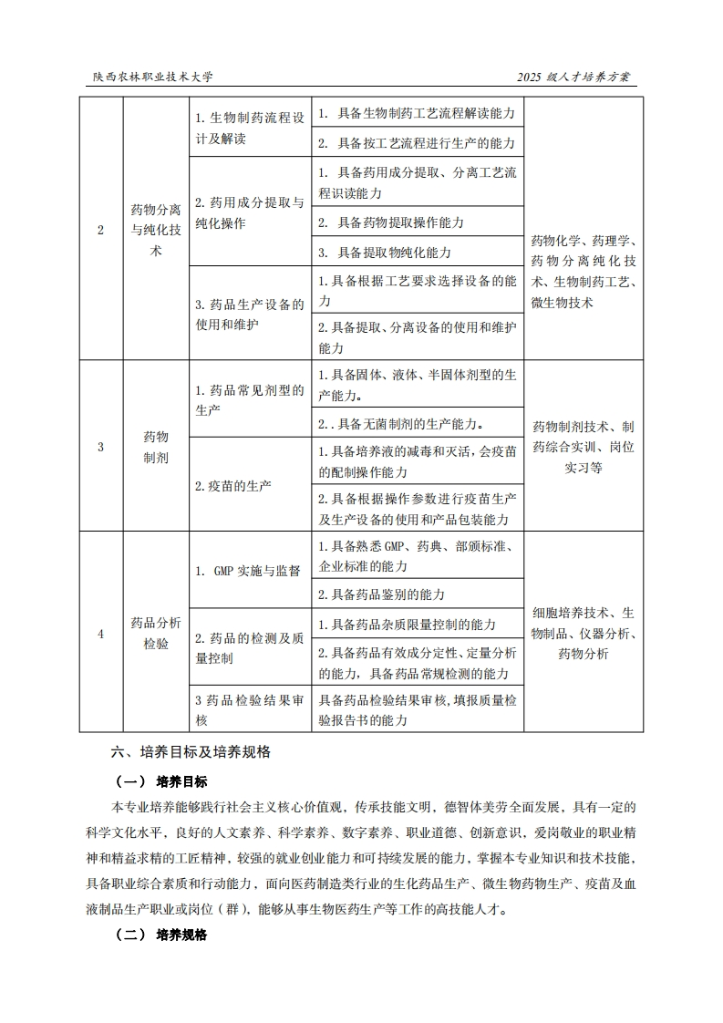 陕西农林职业技术大学2025级人才培养方案《生物制药技术》专业人才培养方案(普通三年制)一、专业名称及代码生物制药技术(490202)二、入学基本要求招生对象:中等职业学校毕业、普通高级中学毕业或具备同等学力。招生类型:物理类、历史类兼收。三、基本修业年限三年。四、职业面向所属专业大类(代码)A食品药品与粮食大类(4902)所属专业类(代码)B生物制药技术专业(490202)对应行业(代码)C生物药品制品制造(276)药物制剂人员6-12-03(GBM61203)主要职业类别(代码)D生物药品制造人员6-12-05(GBM61205)生化药品生产岗位群、微生物药物生产岗位群、疫苗及血主要岗位(群)或技术领域E液制品岗位群生化药品制造工证书、发酵工程制药工证书、药物制剂工职业类证书F证书,药物检验员证书五、职业岗位与职业能力分析序号工作岗位典型工作任务职业能力支撑课程1.具备从动物组织分离细胞并进行原代培养的能力1.细胞培养技术2.具备传代培养、细胞冻存与复苏的能力原料药的细胞培养技术、基生产2.基因工程制药技1.具备载体选择、质粒重组的能力因工程制药技术、术2.具备基因工程菌培养的能力发酵技术3.微生物发酵制药1.菌种选育、种子扩大培养的能力技术2.微生物发酵过程及参数的控制