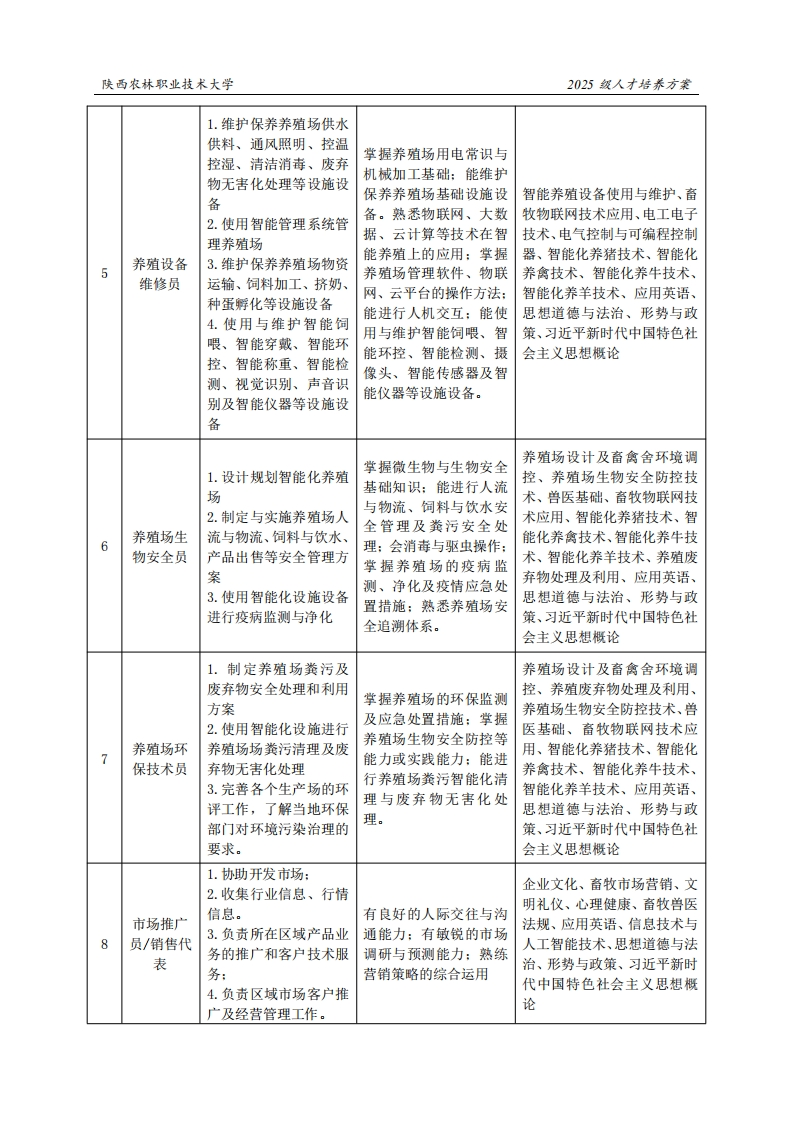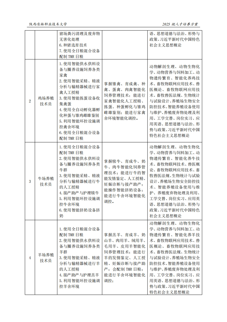 陕西农林职业技术大学2025级人才培养方案《畜禽智能化养殖》专业人才培养方案(现代学徒制)一、专业名称(专业代码)畜禽智能化养殖(410307)二、入学基本要求招生对橡:中等职业学校毕业、普通高级中学毕业或具备同等学力。招生类型:物理类、历史类兼收。三、基本修业年限三年。四、职业面向所属专业大类(代码)农林牧渔大类(41)所属专业类(代码)畜牧业类(4103)对应行业(代码)家畜饲养(031)家禽饲养(032)畜牧专业及辅助性活动(053)畜禽种苗繁育人员(5-03-01)畜禽饲养人员(5-03-02)主要职业类别(代码)其他畜牧业生产人员(5-03-99)畜禽智能化饲养管理、畜禽良种繁育、养殖场废弃物无害化主要岗位(群)或技术领域举例处理、养殖设备维护保养、畜禽生产智能化控制、养殖场生物安全防控家畜繁殖员职业类证书举例1+X家庭农场畜禽养殖五、职业岗位与职业能力分析序号工作岗位典型工作任务职业能力支撑课程1.使用智能供水供料设动物解剖生理、动物生物化备与圈养设施饲养各类学、动物营养与饲料加工、动猪只掌握猪舍环境智能化调物遗传繁育、智能化养猪技2.使用智能采精、精液控、猪良种繁育、智能术、畜牧物联网应用技术、兽分析与输精器械进行猪饲喂、养殖设备维护等猪场养殖医概论、畜牧物联网应用技技术员的人工授精技术,具有猪舍智能化术、企业文化、兽医概论、畜3.使用B超进行妊娠诊饲养管理、养殖场生物牧兽医法规、生物统计与试验断安全防控等能力或实践设计、养殖场生物安全防控技4.利用智能环控设施调能力术、智能养殖设备使用与维控猪舍环境护、养殖废弃物处理及利用、5.使用智能化设施进行工学交替、岗位实习、应用英